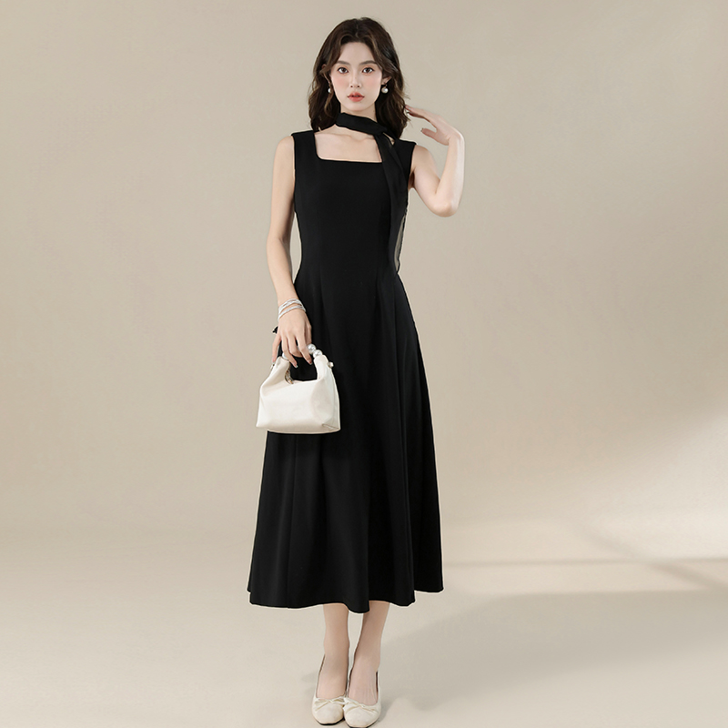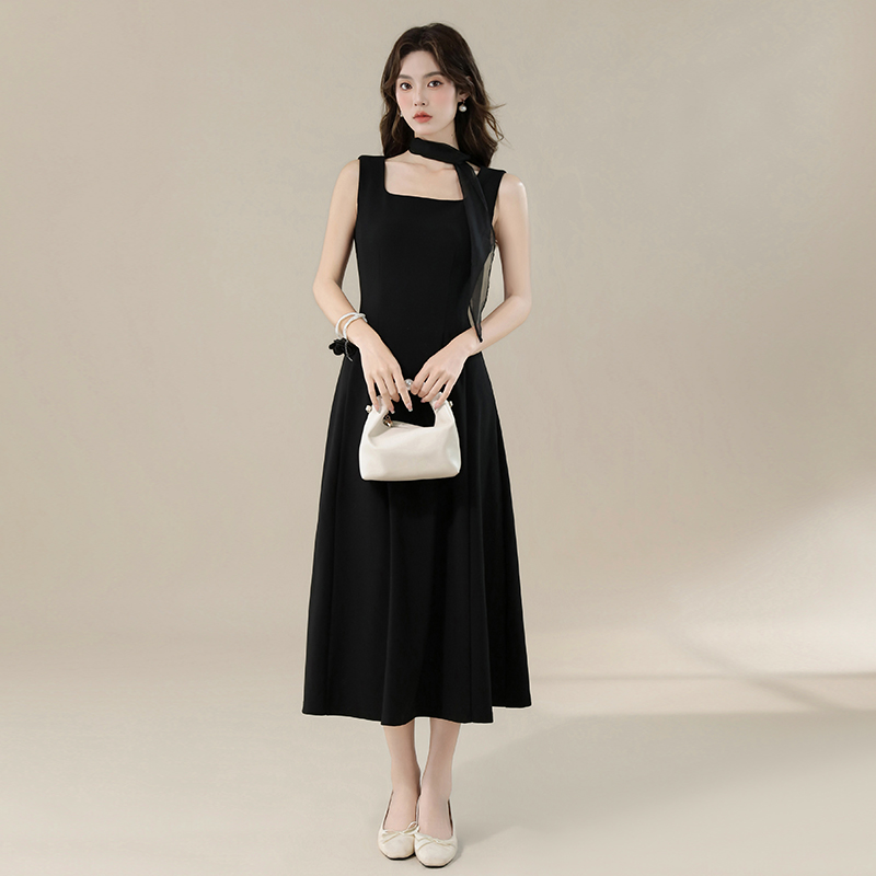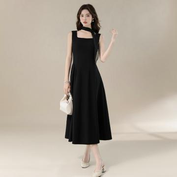 BY16696# 夏季新款法式优雅方领简约飘带设计感收腰显瘦长款小黑裙