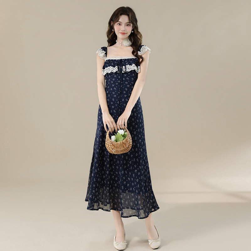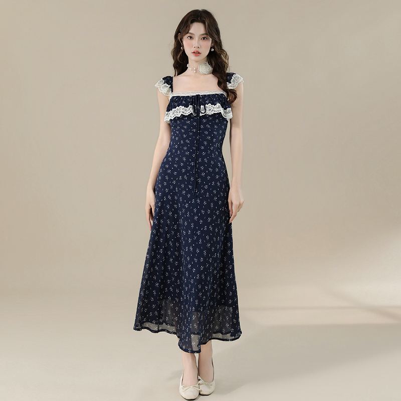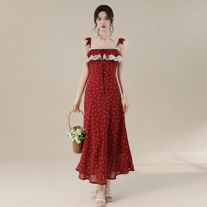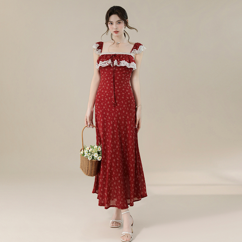 BY16701# 夏季新款法式方领蕾丝边优雅减龄度假风长款碎花连衣裙