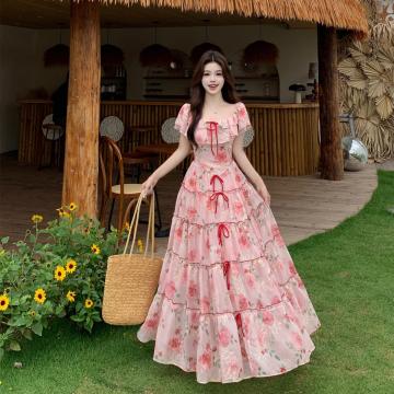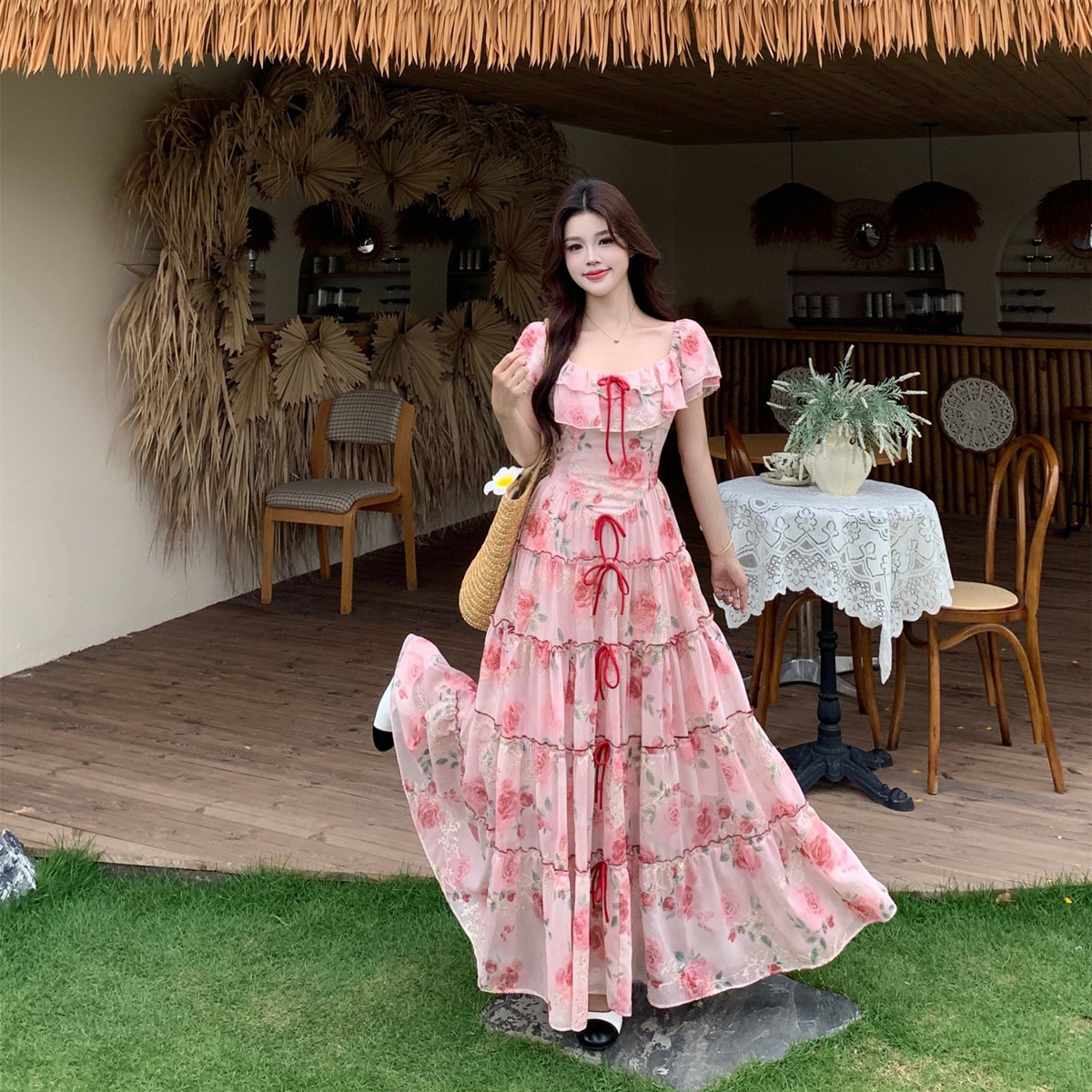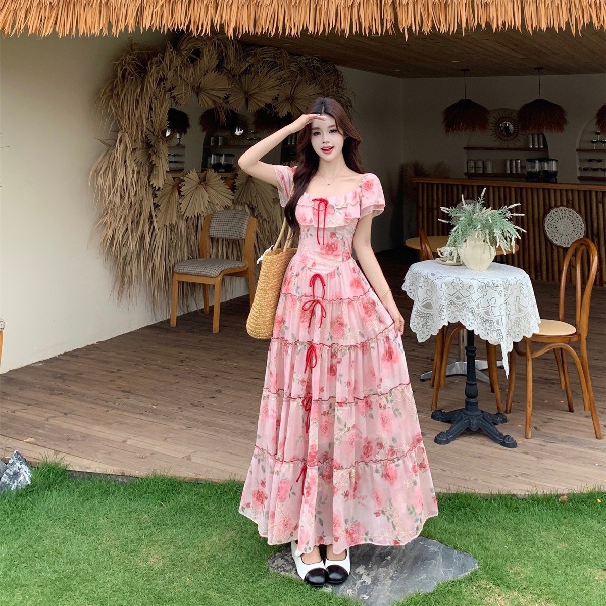 BY16720# 甜梦蔷薇夏季复古荷叶边蝴蝶结长裙收腰碎花连衣裙