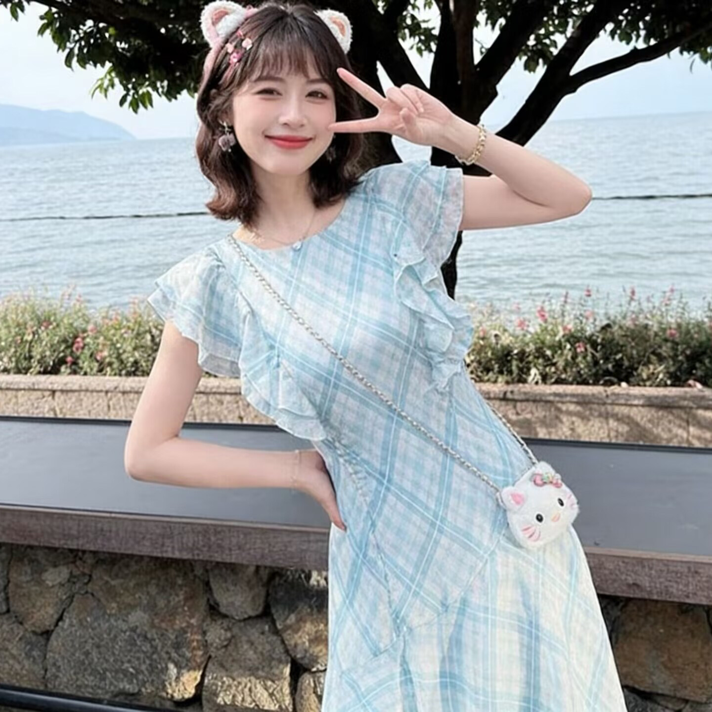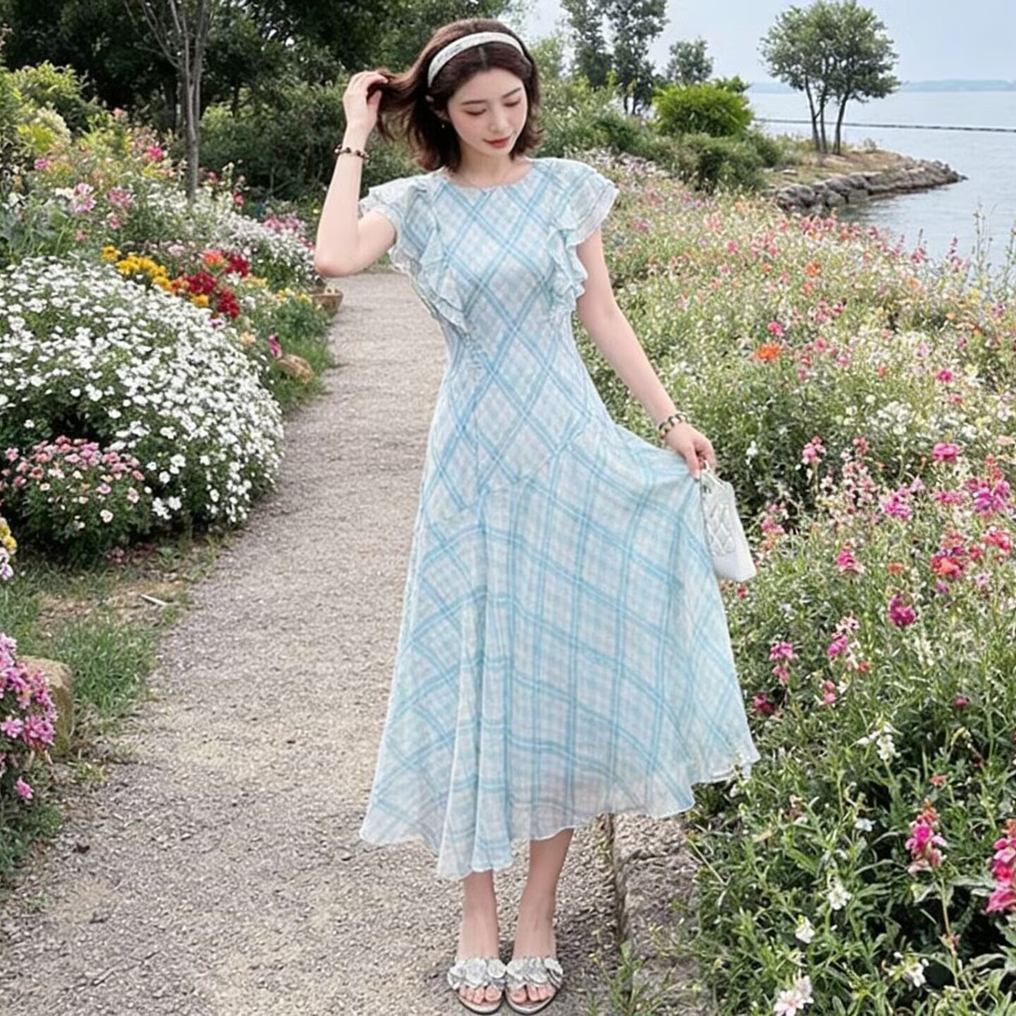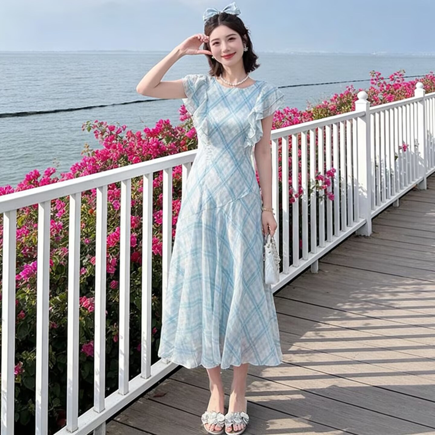 BY16773# 海盐椰椰飞袖荷叶边格纹鱼尾裙女夏收腰系带温柔风长裙