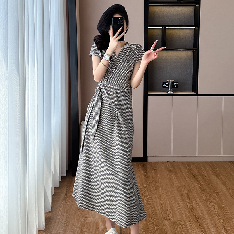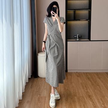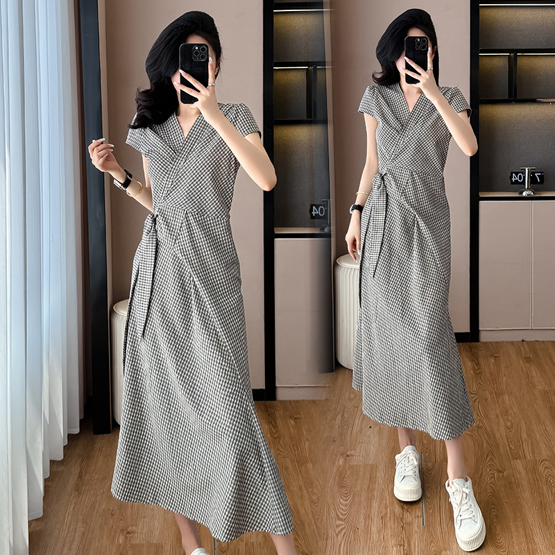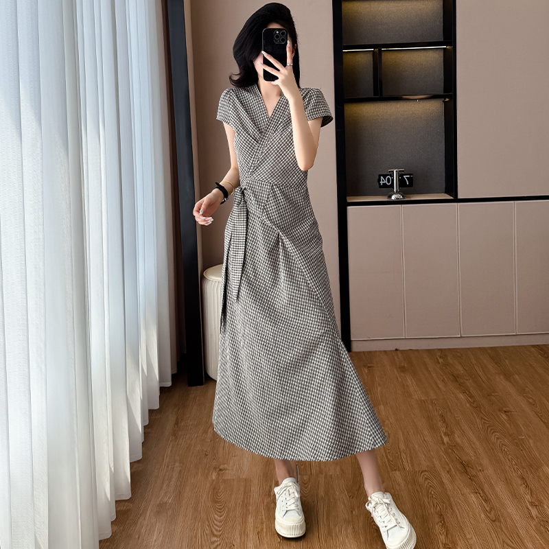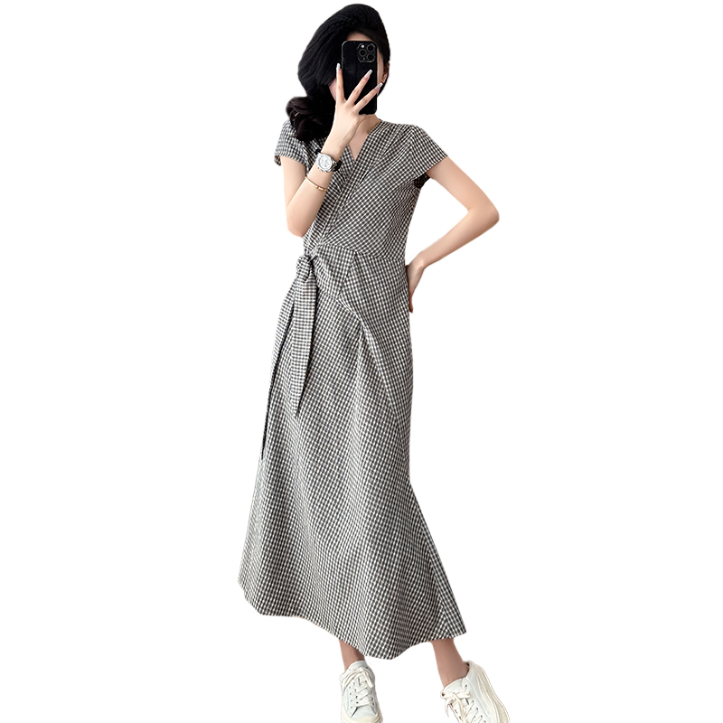 BY16775# 新款格子韩系春夏设计感小个子设计感交叉绑带连衣裙长裙