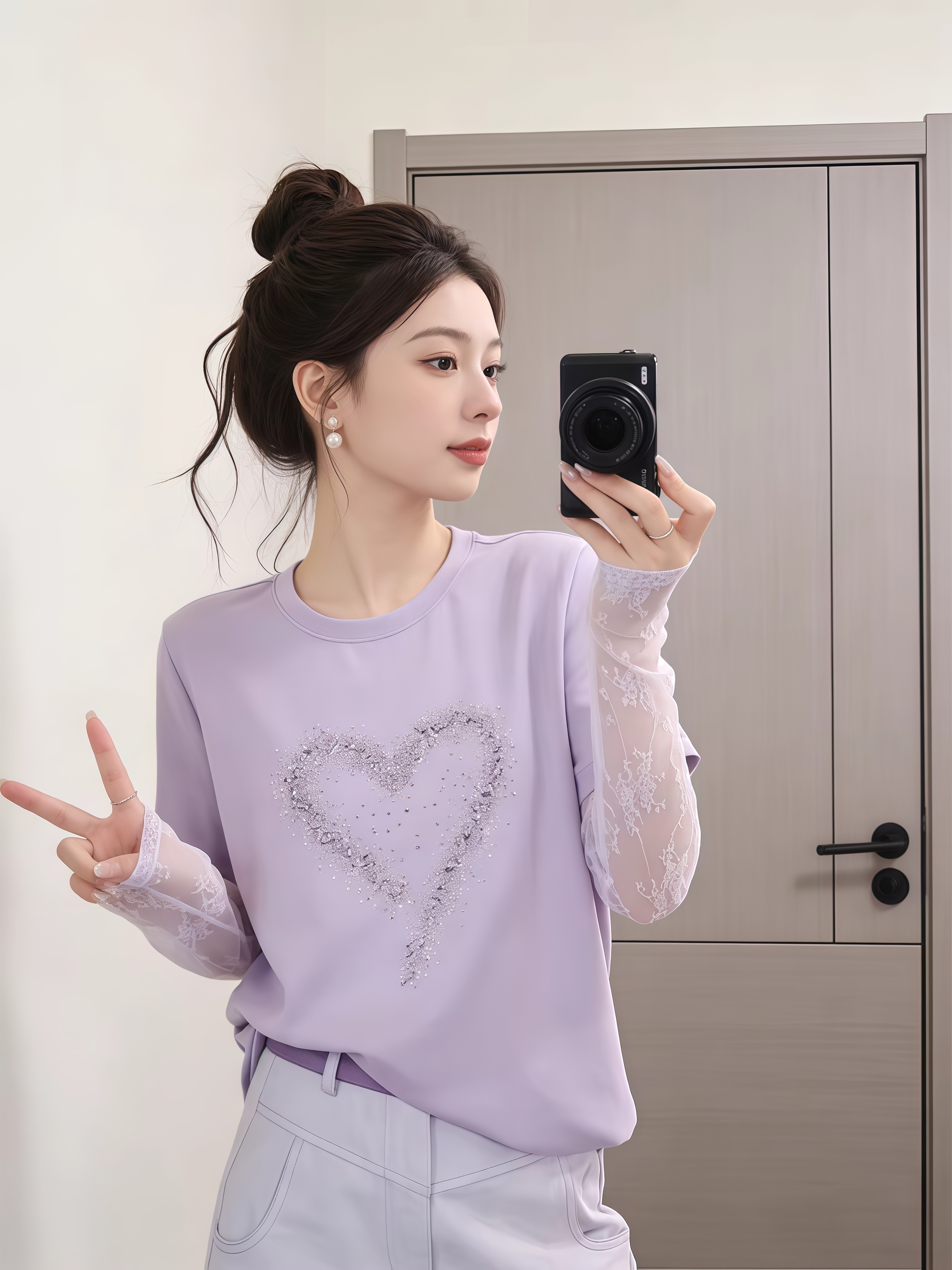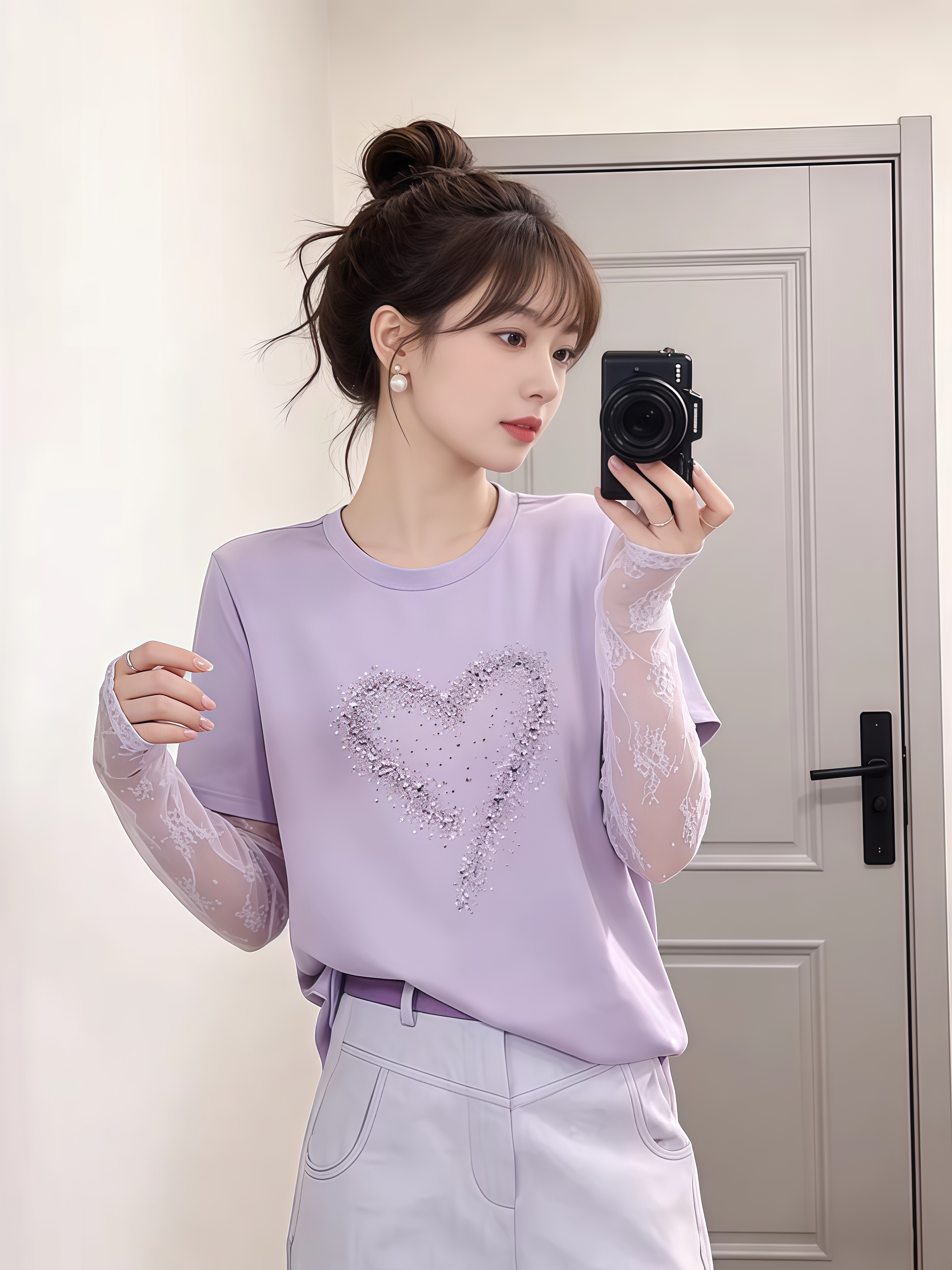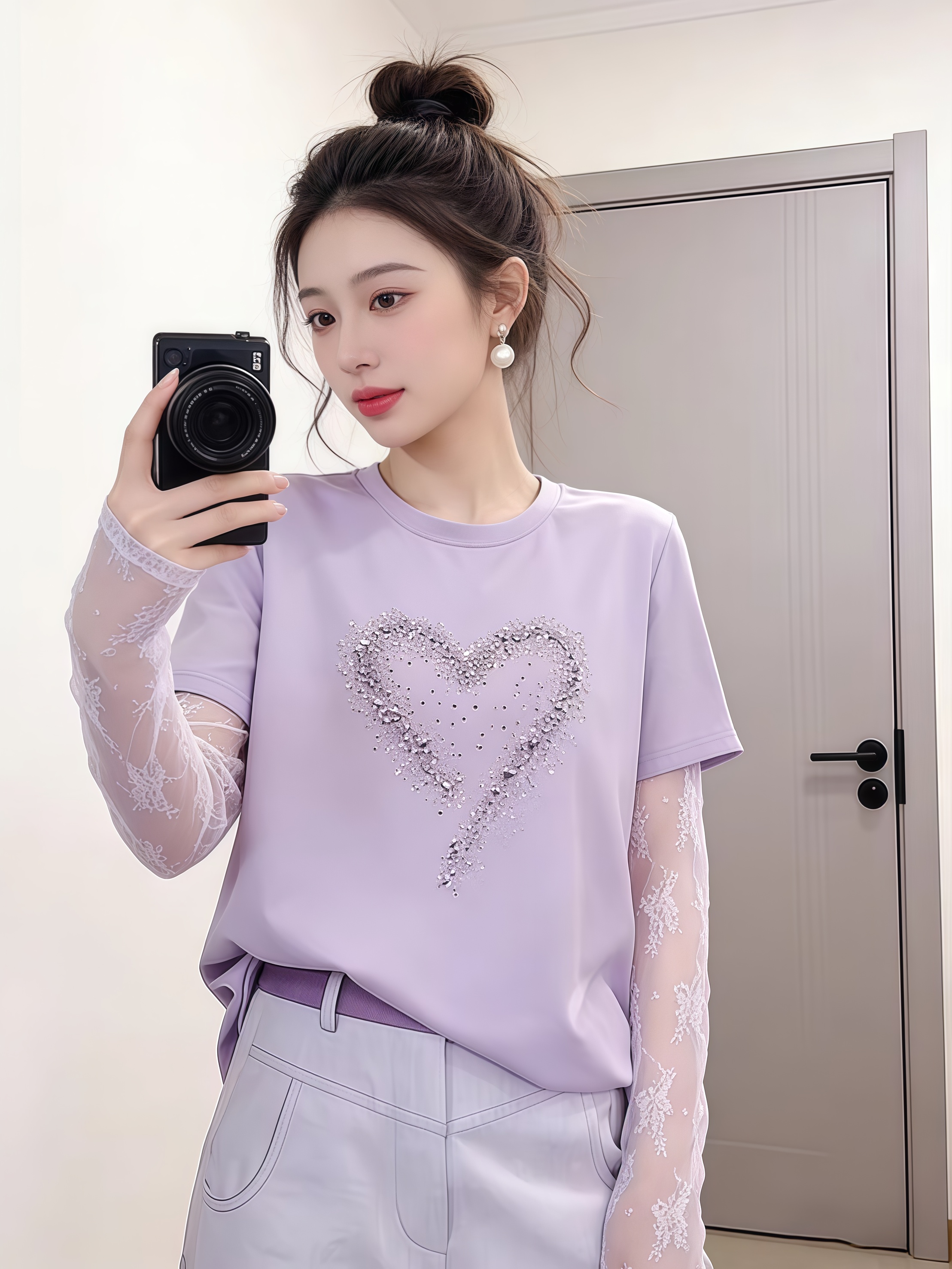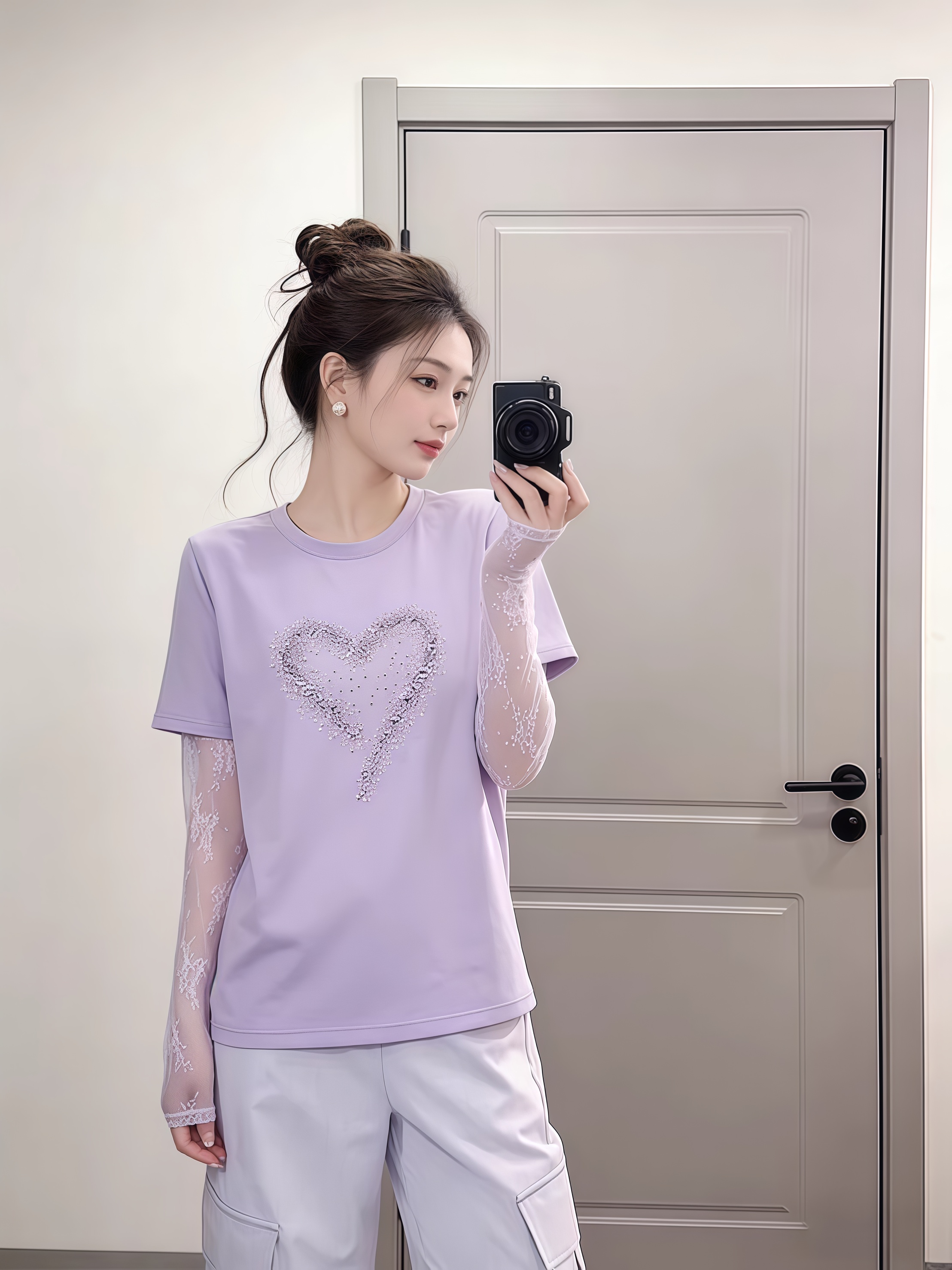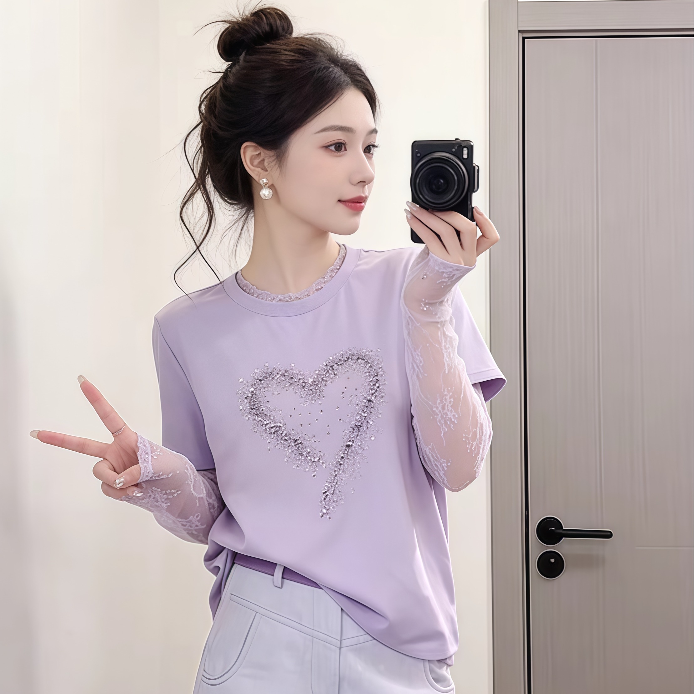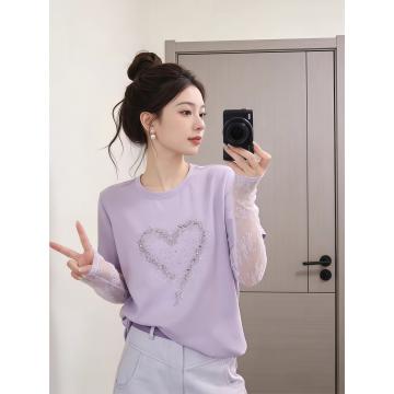 BY16913# 甜妹风漂亮爱心拼接蕾丝假两件长袖T恤夏季时髦洋气百搭上衣 服裝批發女裝批發服飾貨源