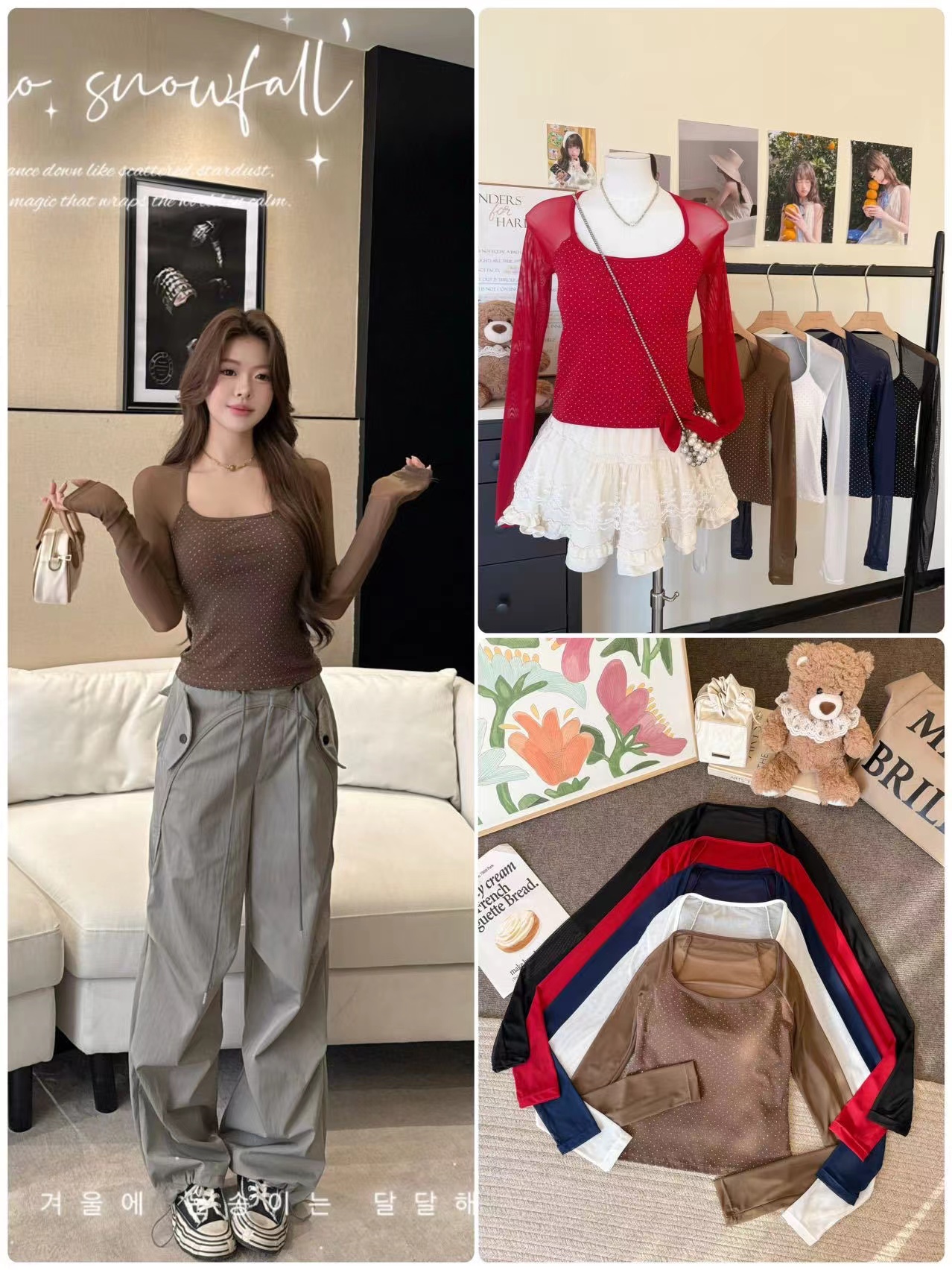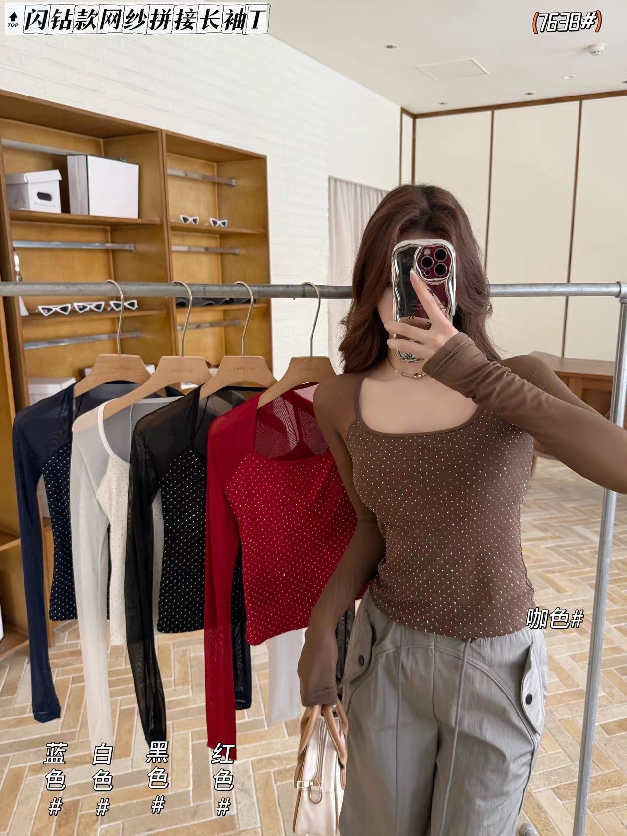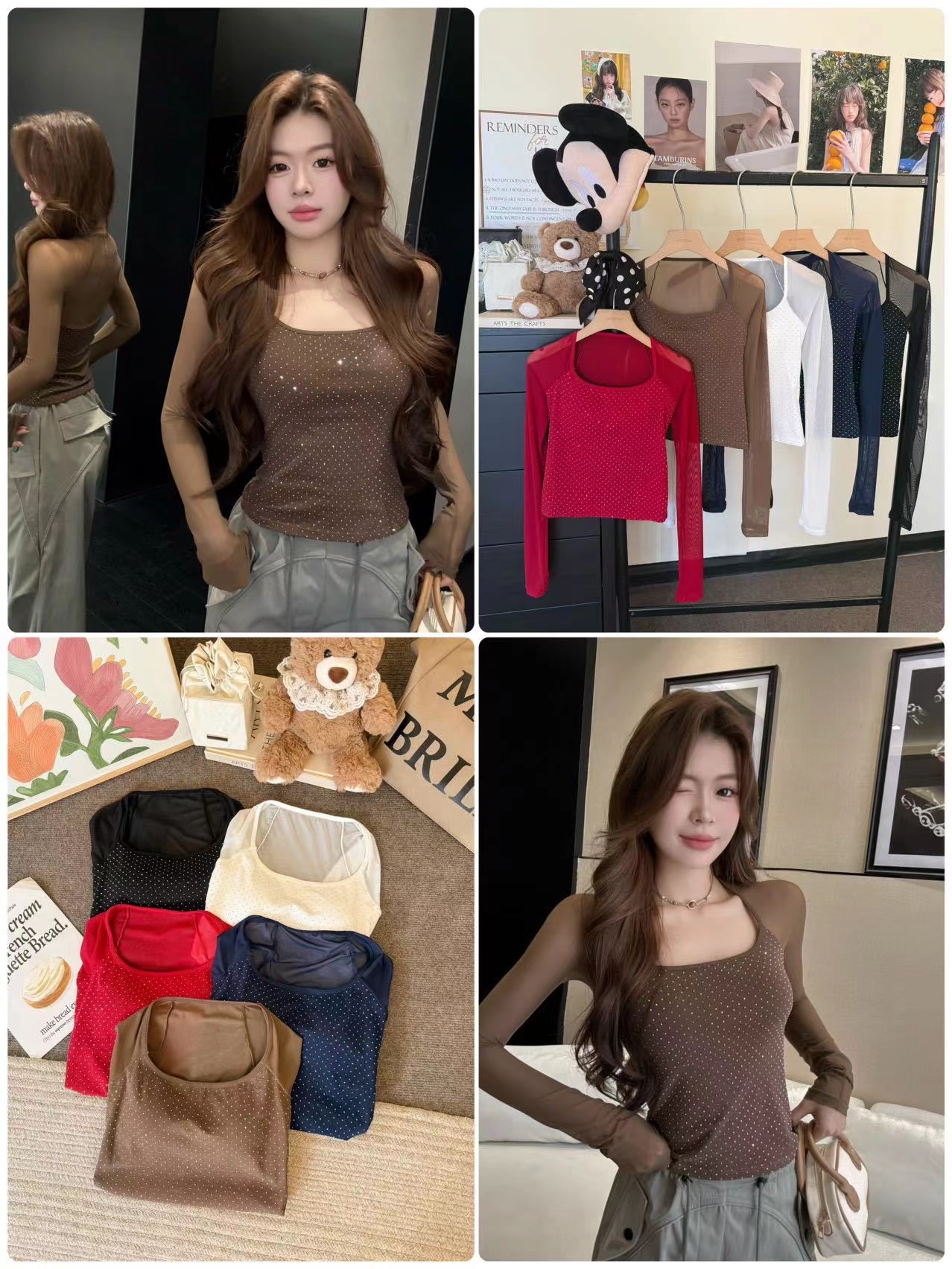 BY16962# 夏季新款纯欲风满钻拼接网纱长袖T袖修身显瘦一体式带胸垫女 服裝批發女裝批發服飾貨源