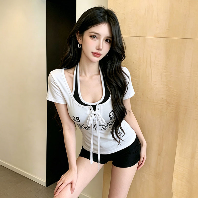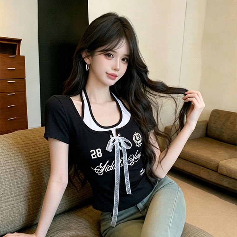 首页 > 短袖T恤 > 美式辣妹蕾丝绑带假两件夏季甜辣修身显瘦短款绝美小衫 服裝批發女裝批發服飾貨源