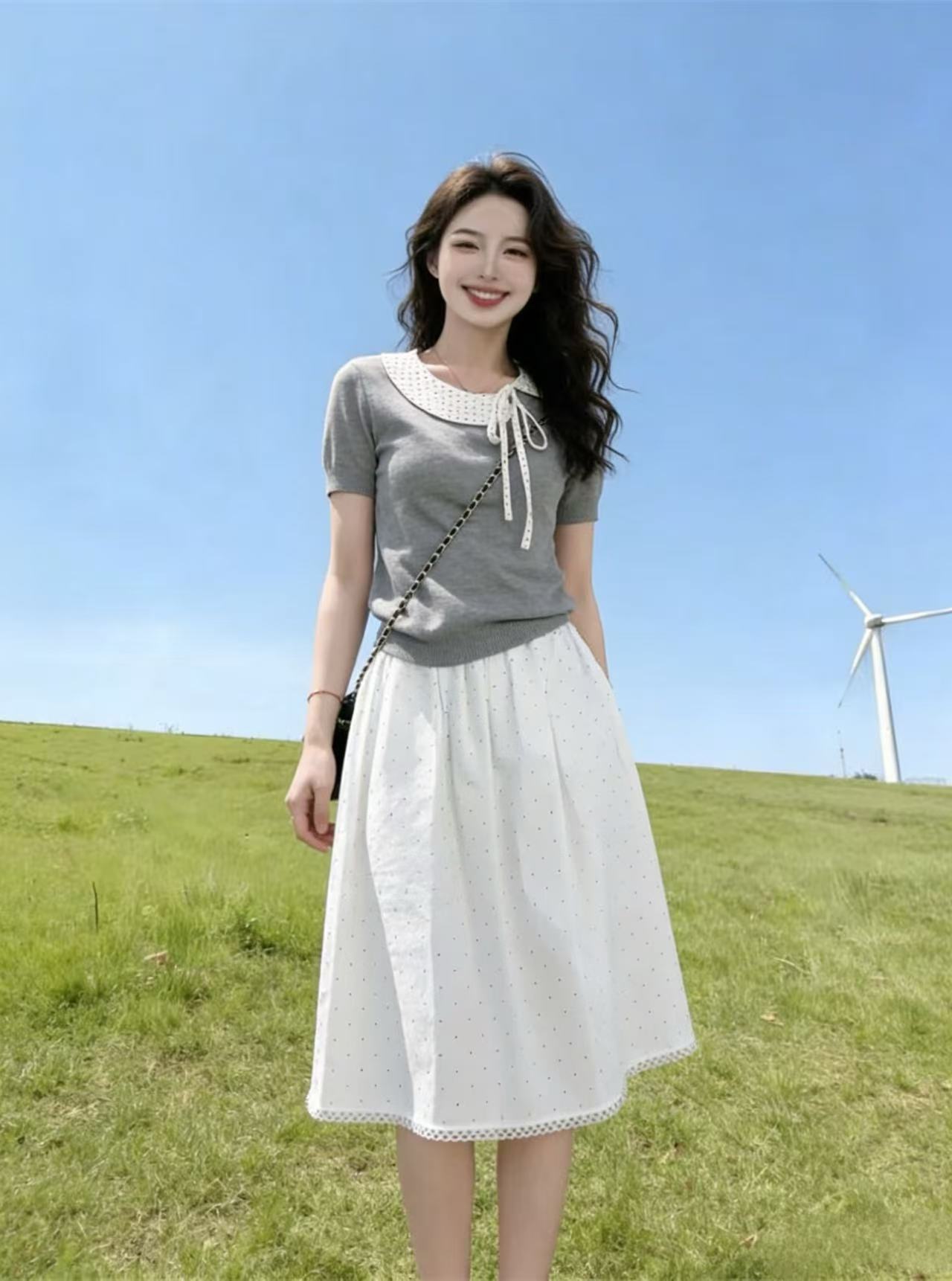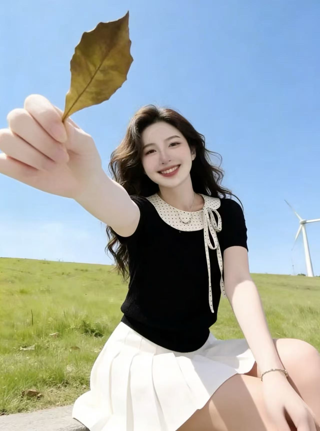 韩系休闲风时尚娃娃领短袖T恤女春季新款拼接设计感针织上衣 服裝批發女裝批發服飾貨源