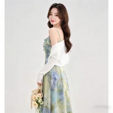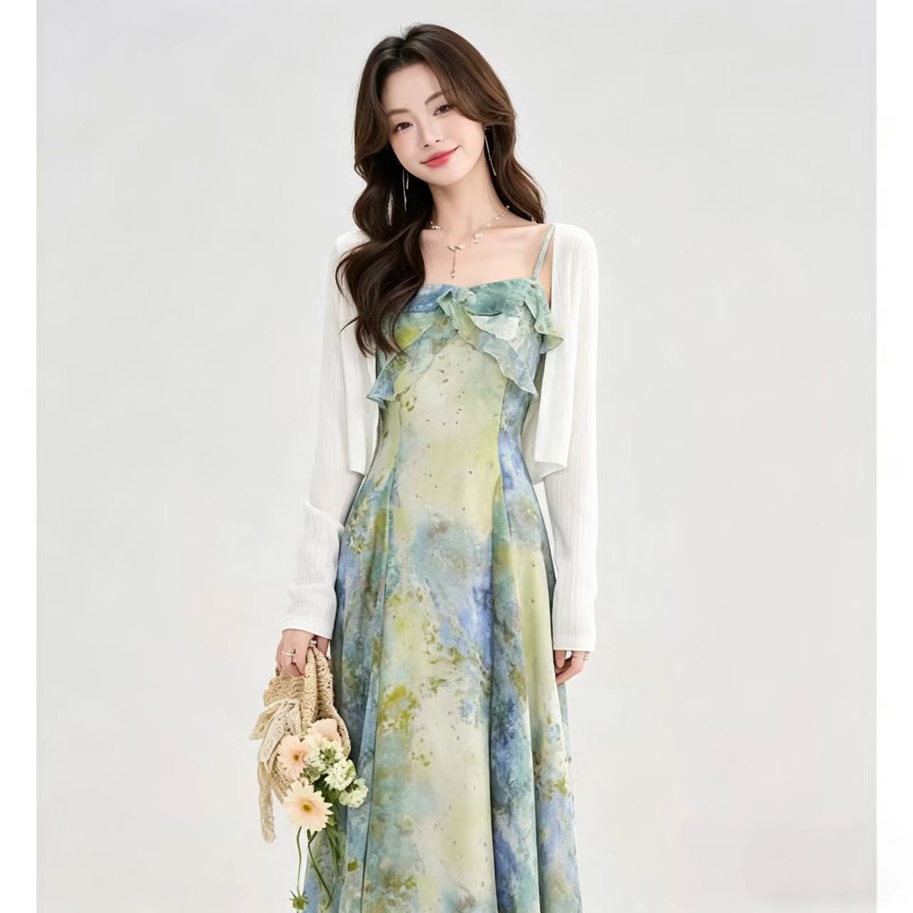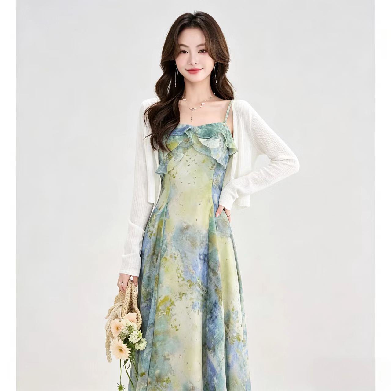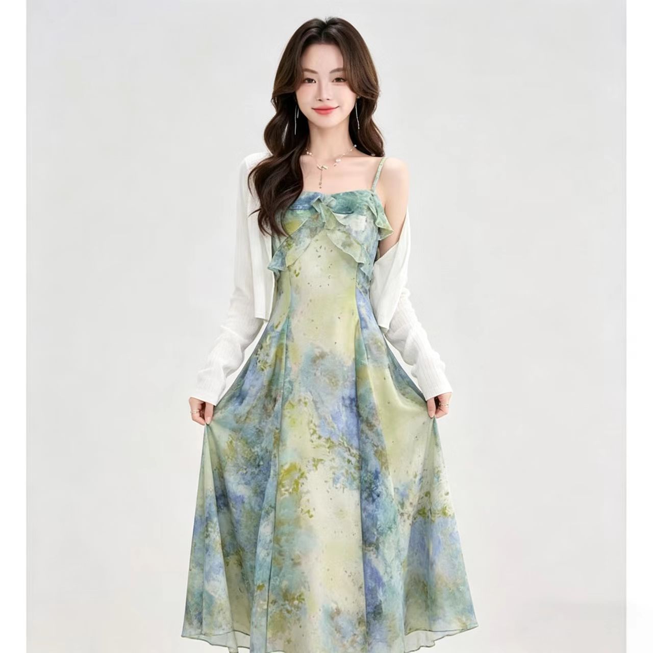 气质百搭设计感印花吊带连衣裙+开衫法式复古慵懒海边度假风套装 服裝批發女裝批發服飾貨源