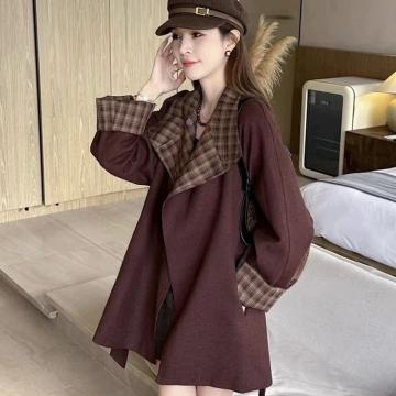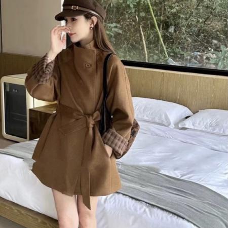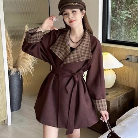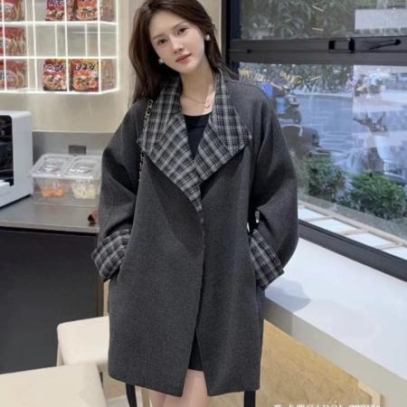 LN76372# 韩系撞色格子拼接毛呢风衣外套女秋新款宽松廓形显瘦百搭大衣