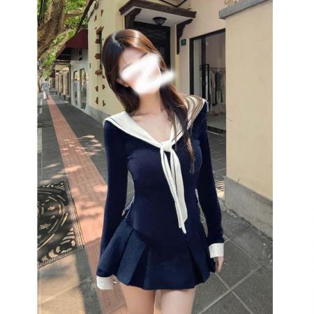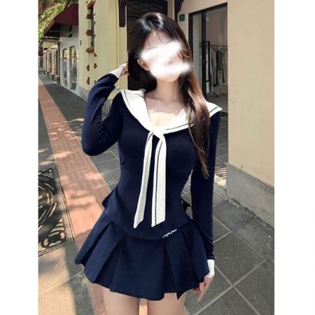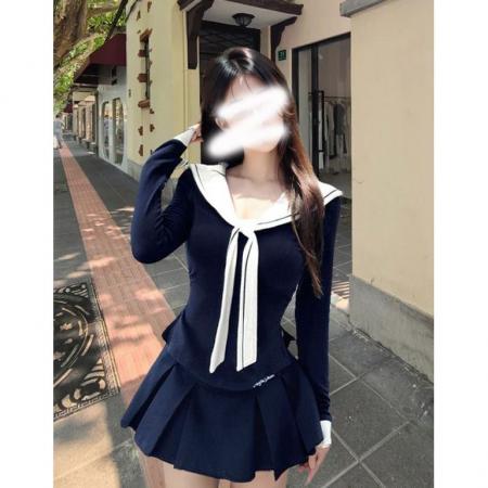 FA53848# LN76424# 可爱甜美风海军领上衣套装女早秋设计感拼接打底衫高腰百褶半身裙