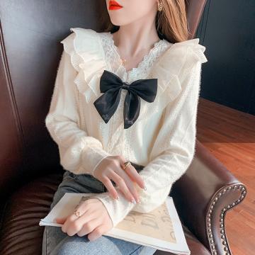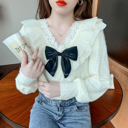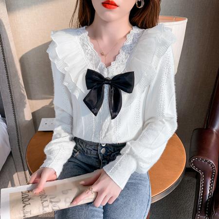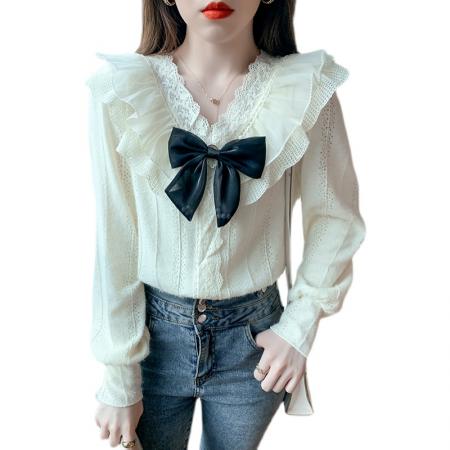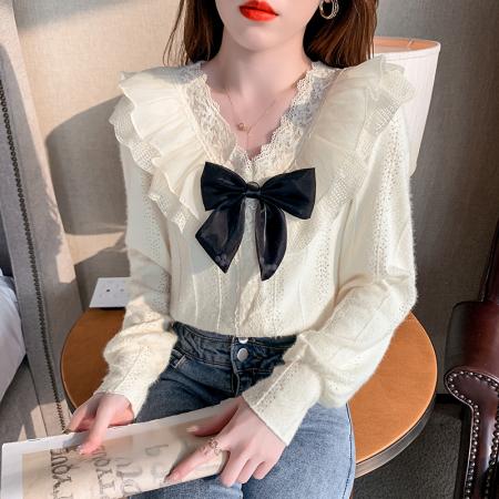 LN76425# 春款小众法式V领蕾丝长袖洋气蝴蝶结荷叶边v领上衣