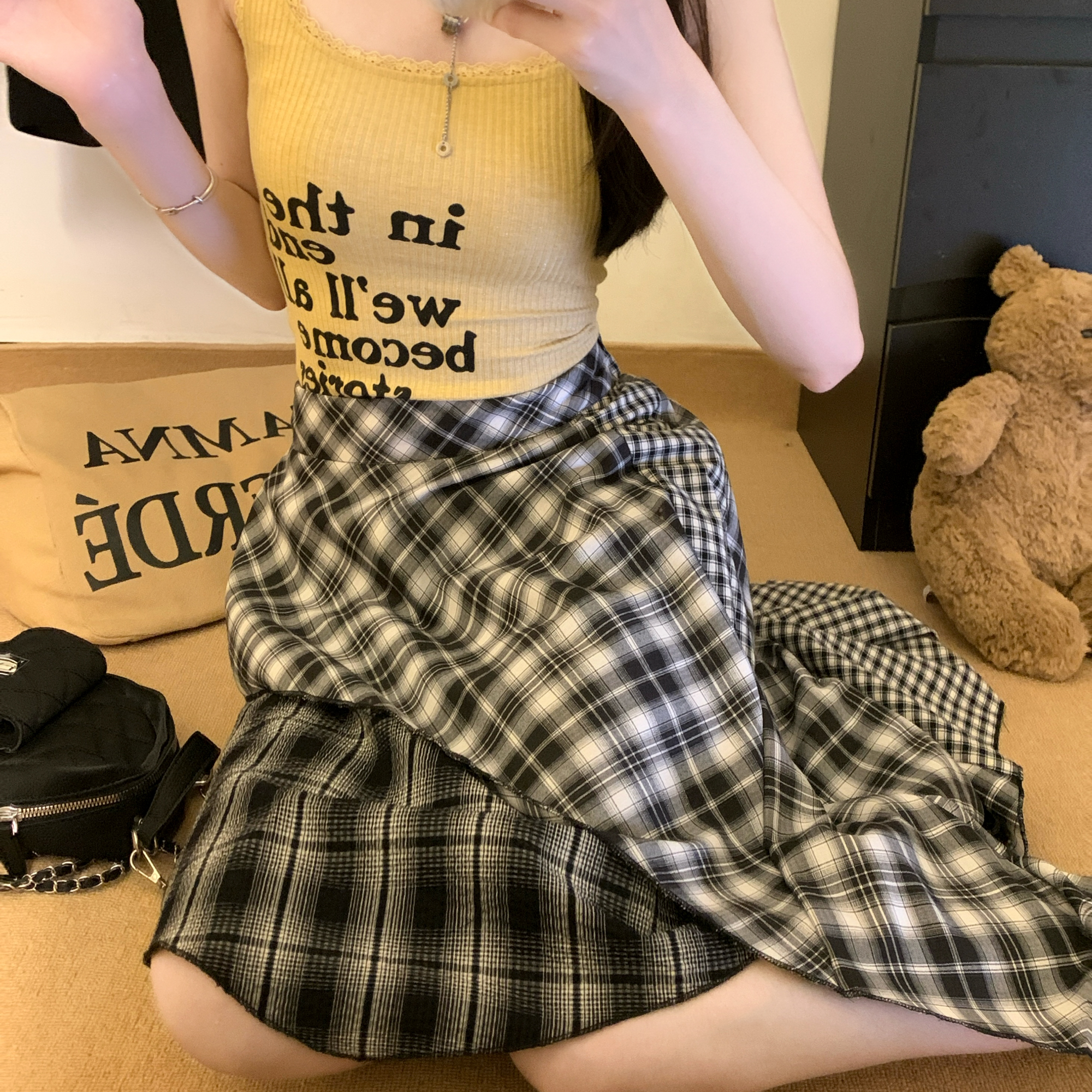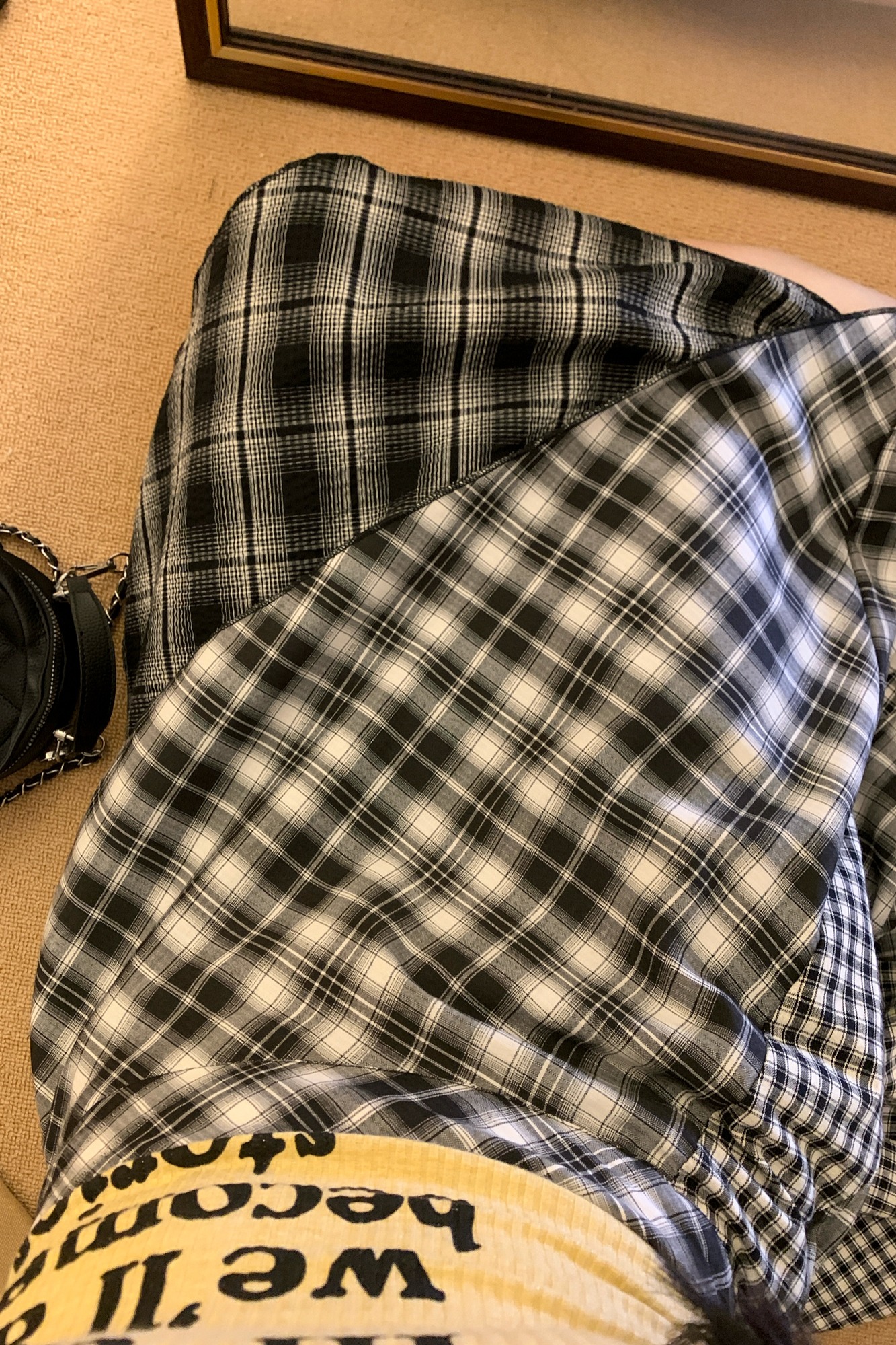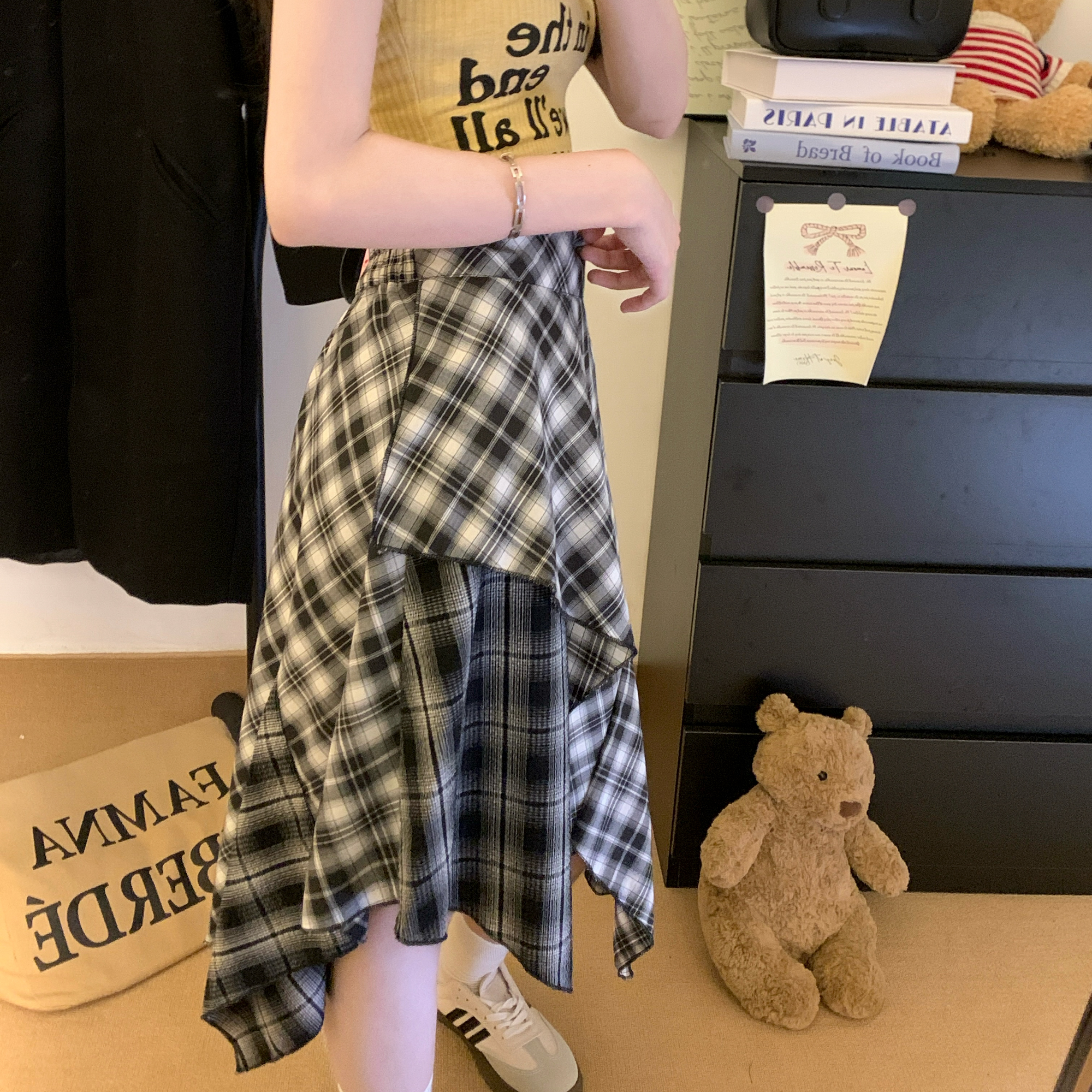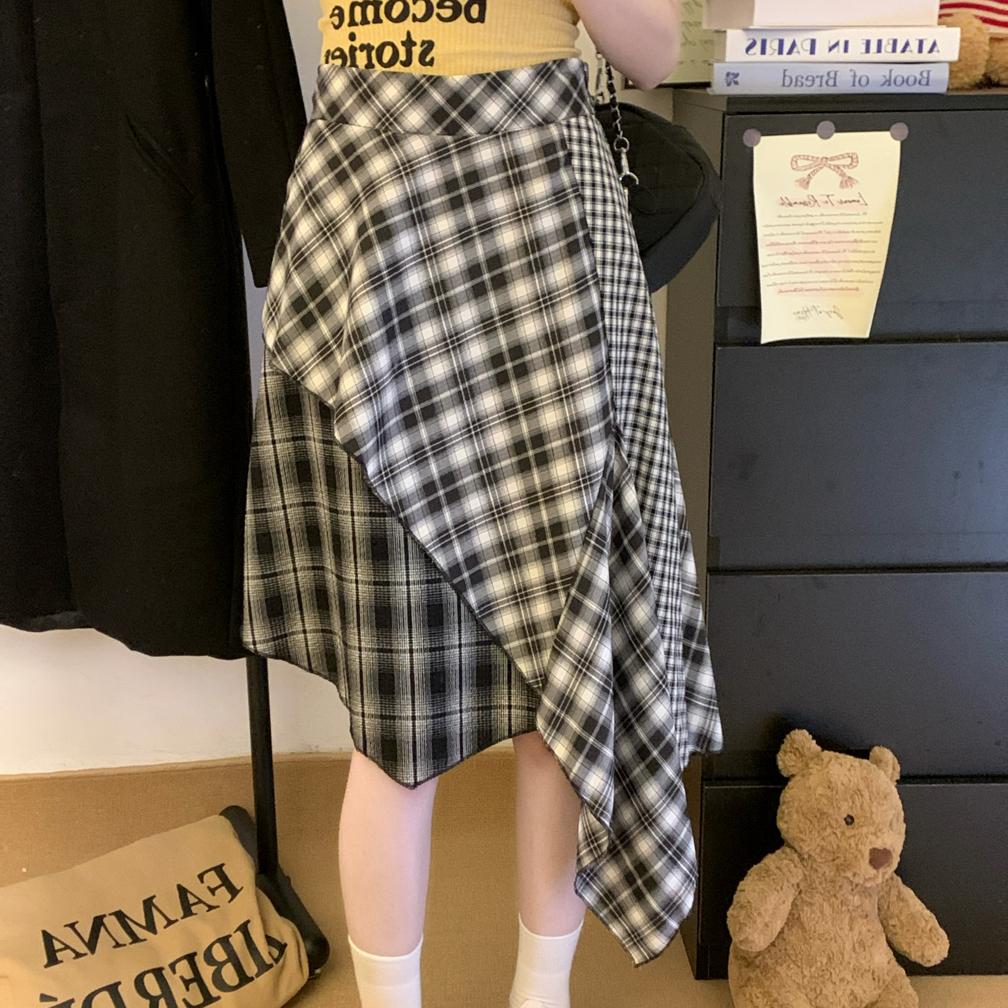 FA33306# 学院风不规则复古辣妹拼接黑白格子半身裙女中长款压褶A字裙 服裝批發女裝批發服飾貨源