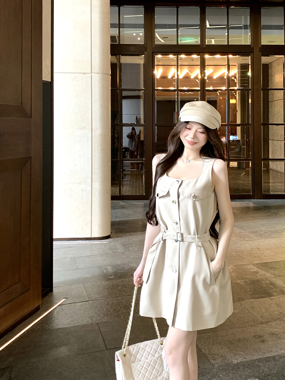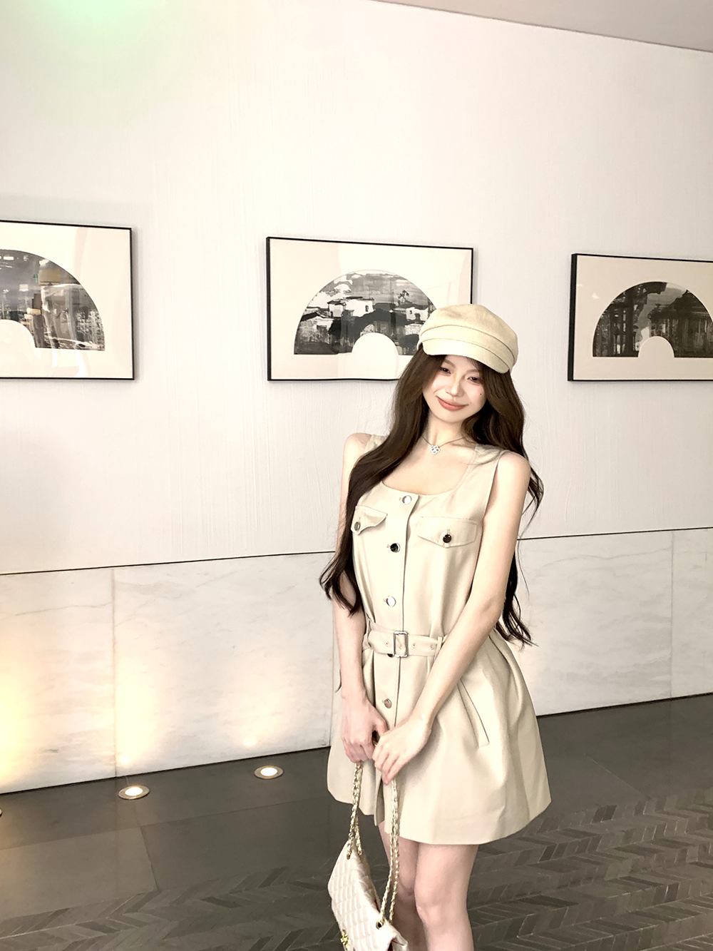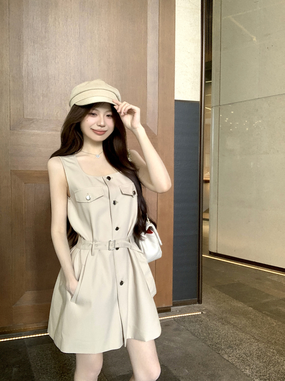 FA33310# 小众卡其色工装背心裙温柔显白收腰短裙 服裝批發女裝批發服飾貨源
