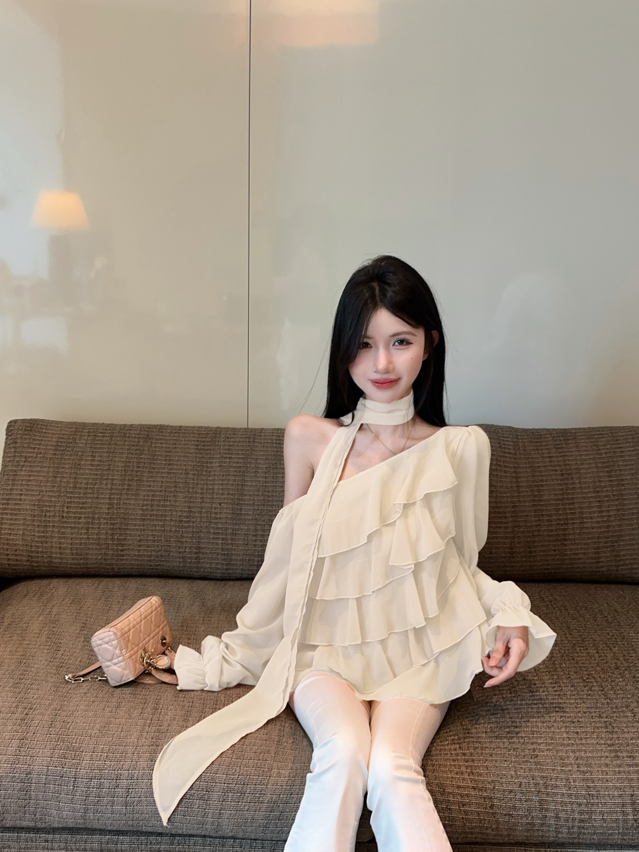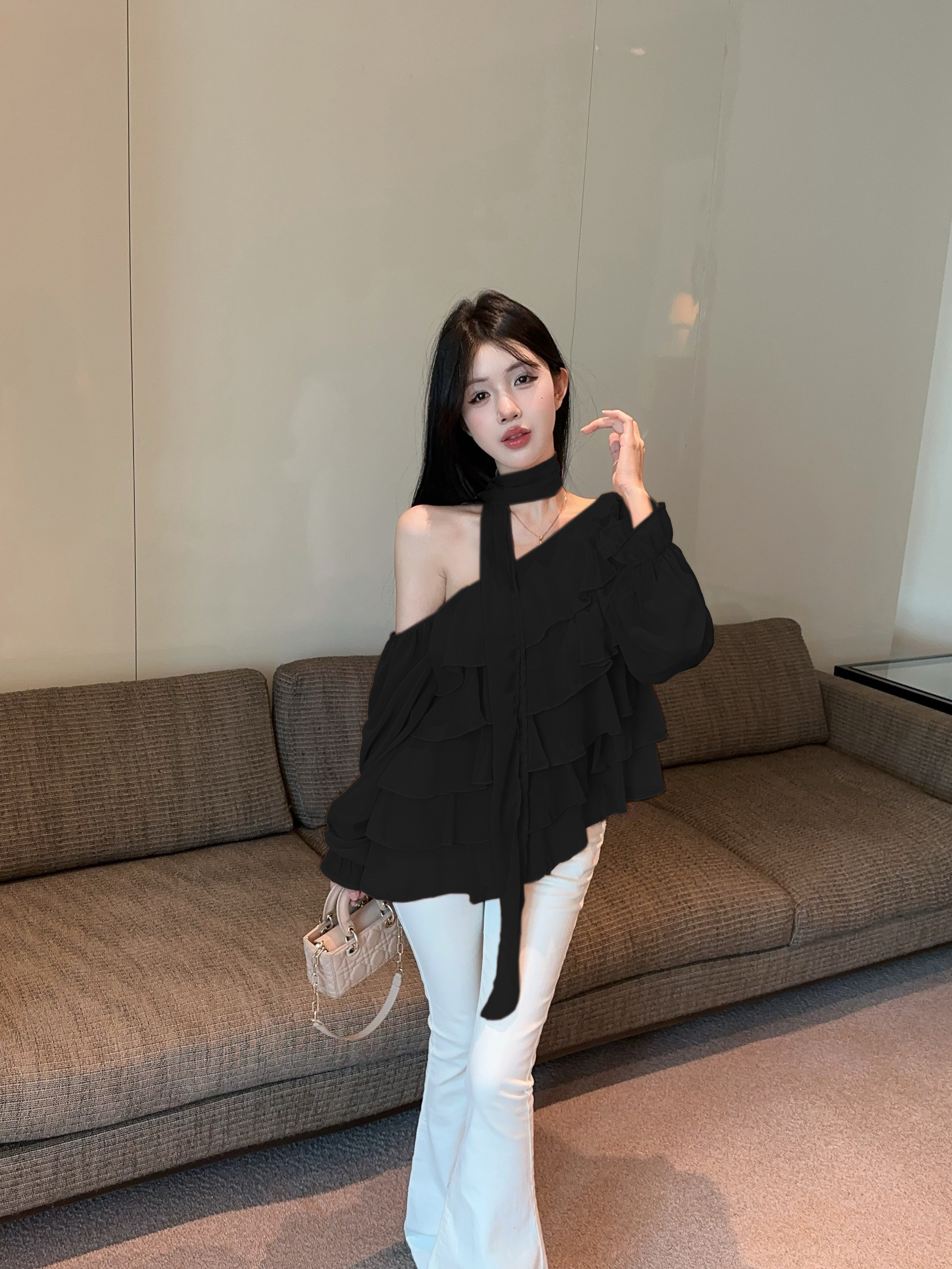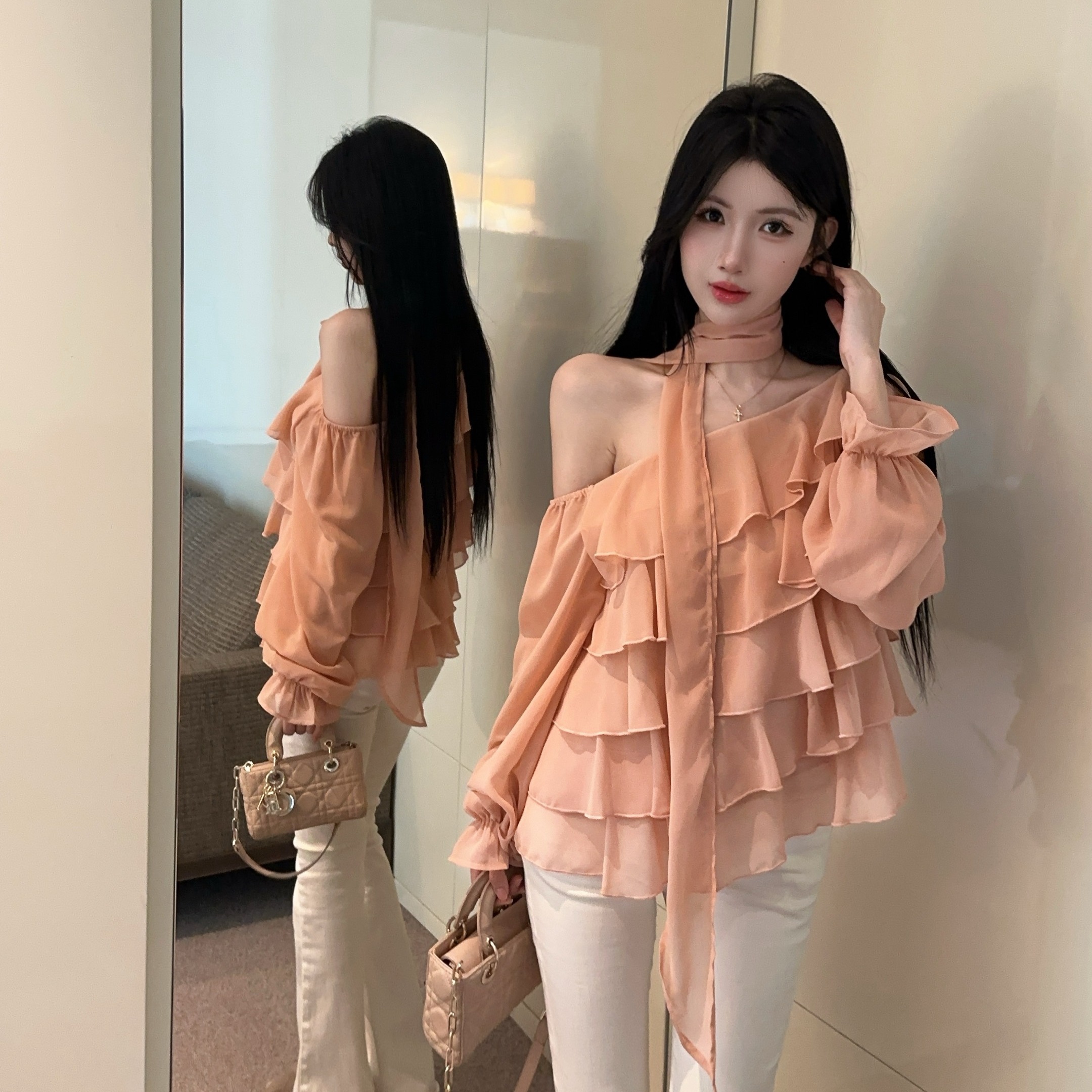 FA41272# 纯欲露肩雪纺蛋糕小衫上衣配飘带 服裝批發女裝批發服飾貨源