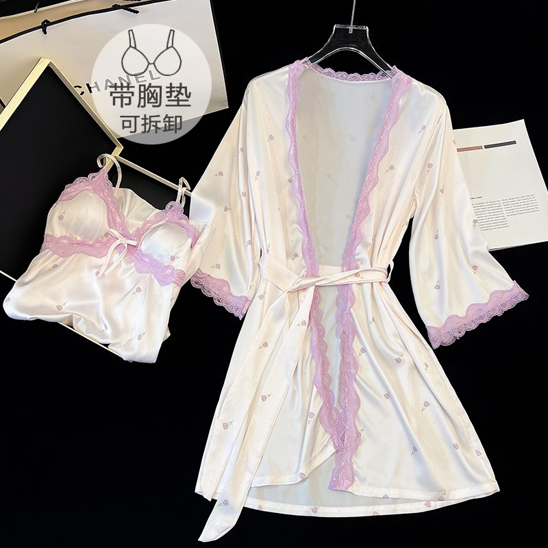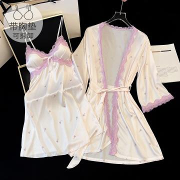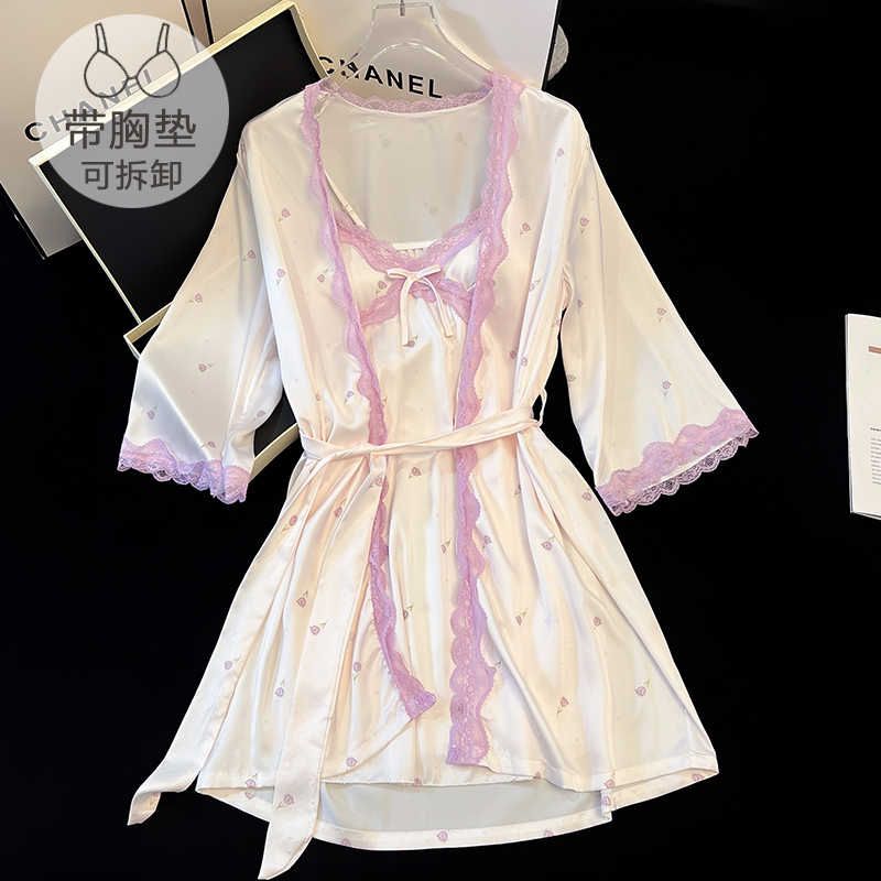 FA41824# 冰丝性感睡衣女士春夏吊带带胸垫中长睡裙开衫睡袍两件套高级气质 服裝批發女裝批發服飾貨源