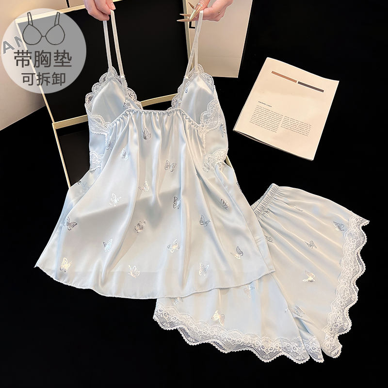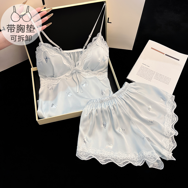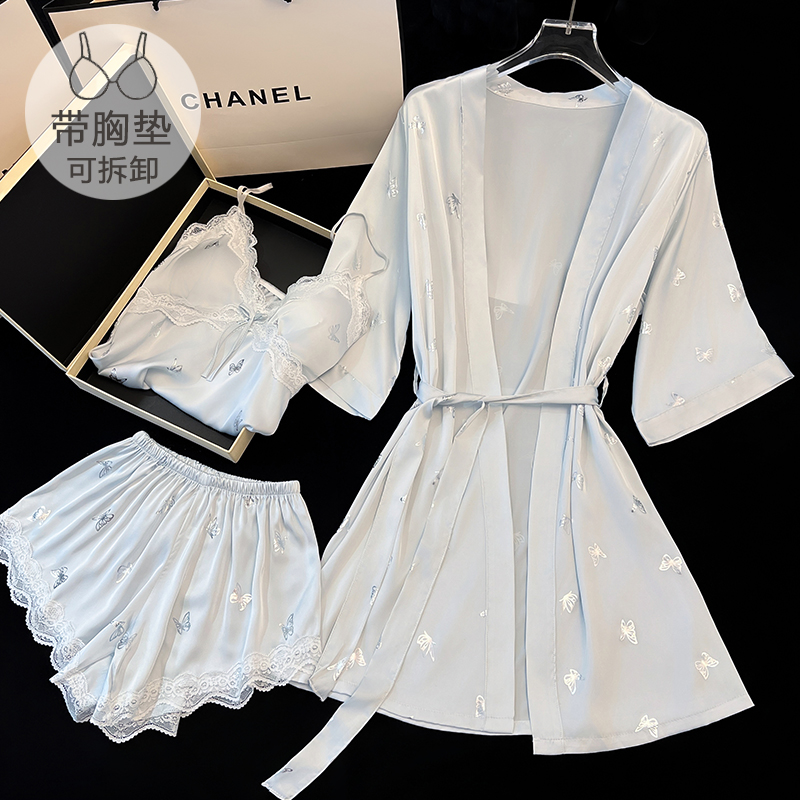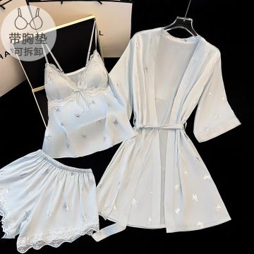 FA41825# 冰丝性感睡衣女士春夏吊带带胸垫短裤开衫睡袍三件套蕾丝高级气质 服裝批發女裝批發服飾貨源