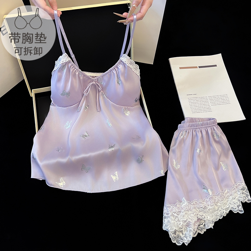 FA41826# 冰丝性感睡衣女士春夏吊带带胸垫短裤开衫睡袍三件套蕾丝高级气质 服裝批發女裝批發服飾貨源