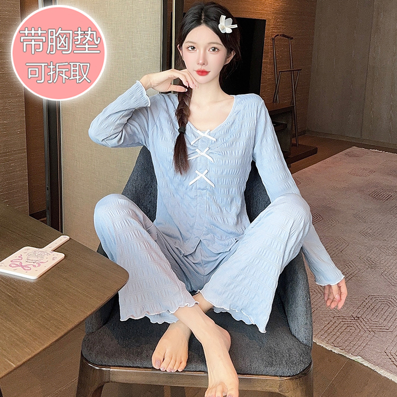 FA41833# 仿棉提花睡衣少女春秋季甜美风带胸垫长袖长裤两件套家居服可外穿 服裝批發女裝批發服飾貨源