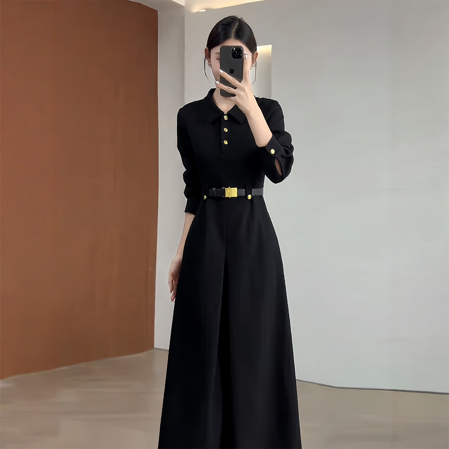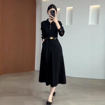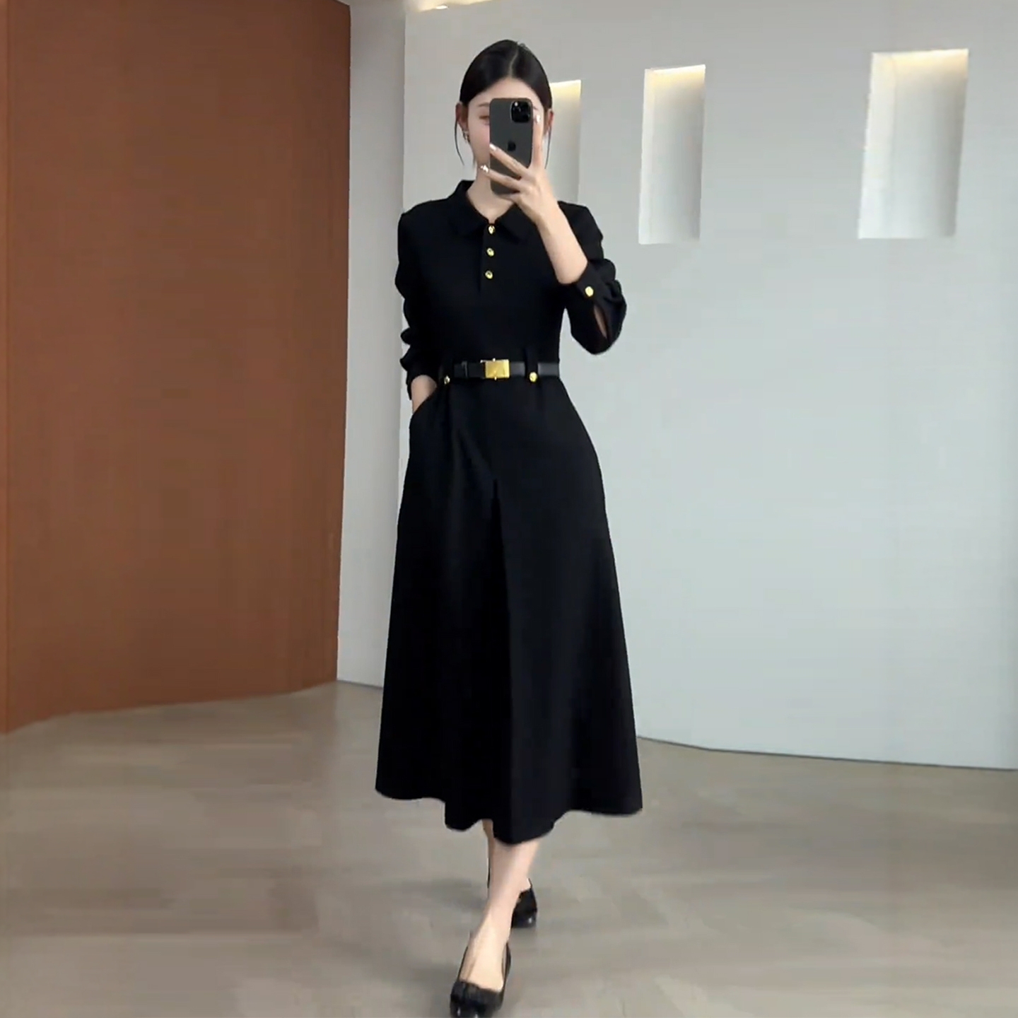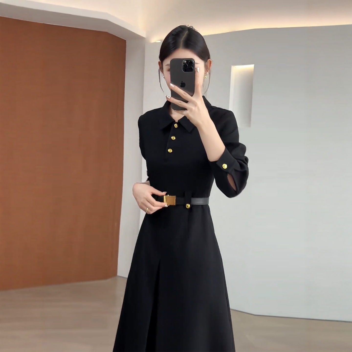 FA42097# 法式赫本风黑色收腰连衣裙女秋季大码胖mm显瘦高级独特漂亮长裙子