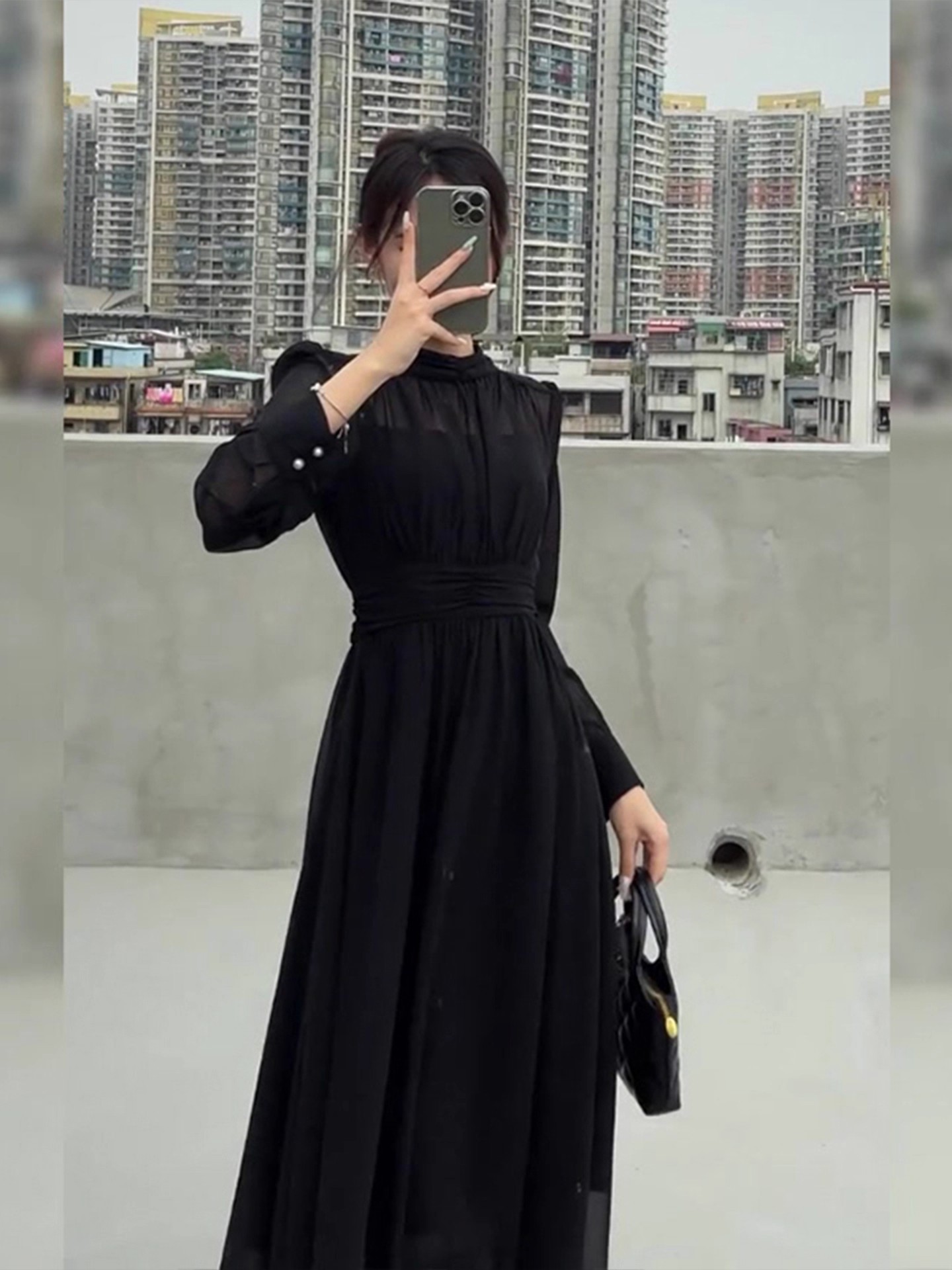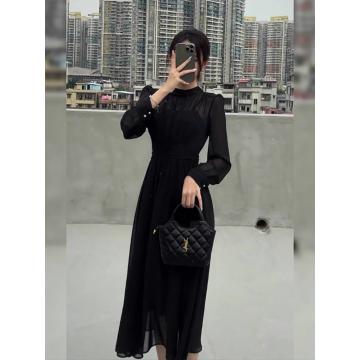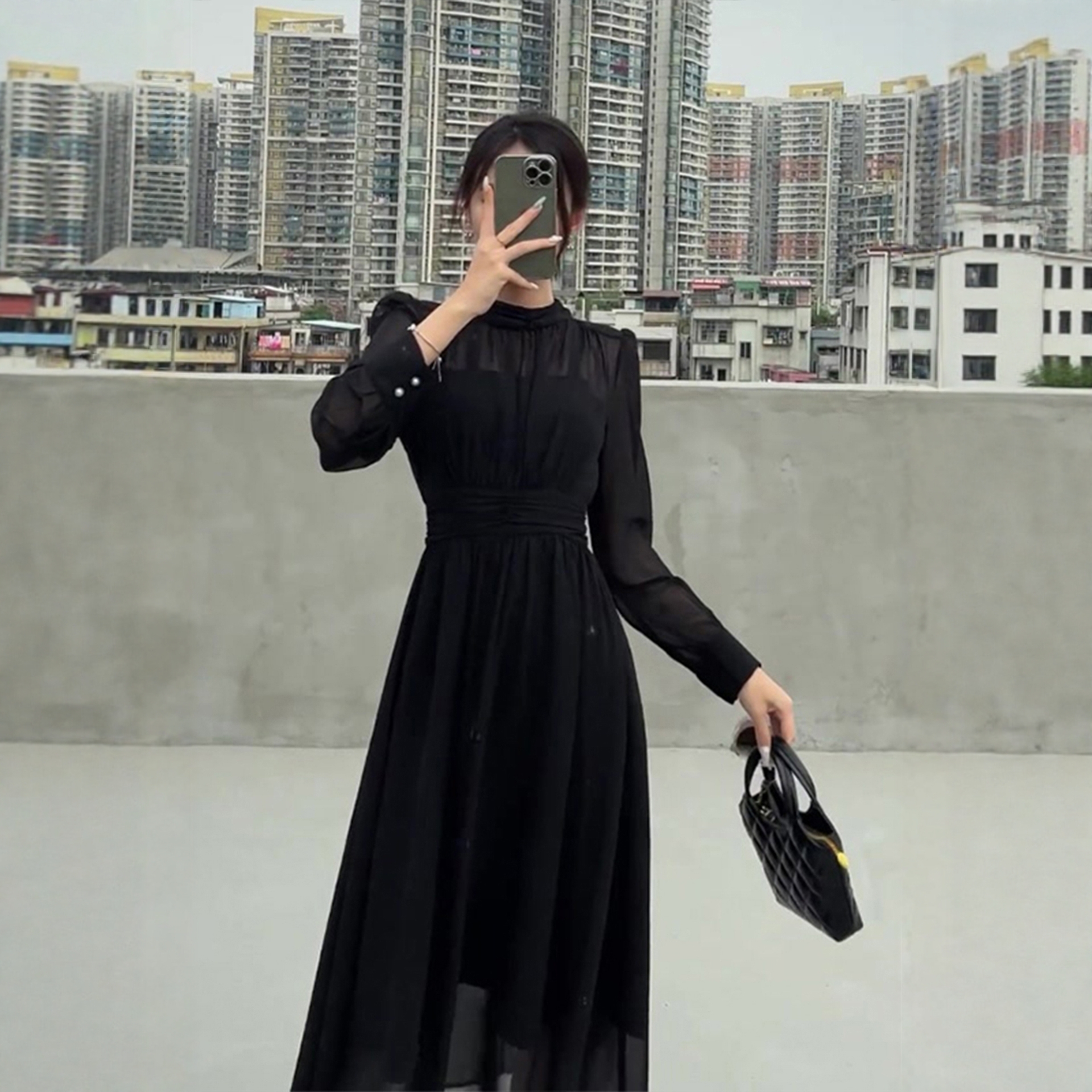 FA42099# 法式气质高级黑色连衣裙女秋季新款大码胖mm郝本风独特漂亮长裙子