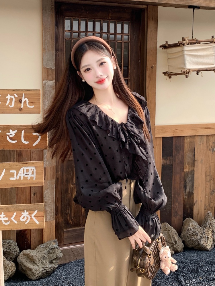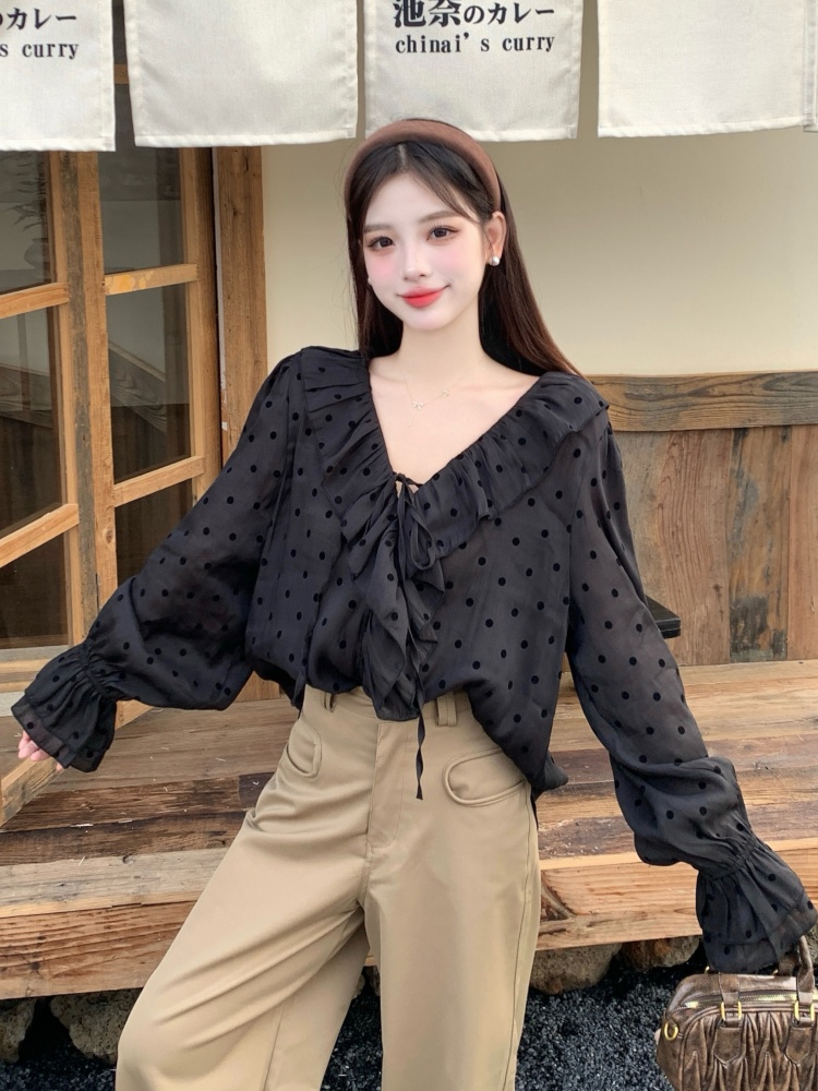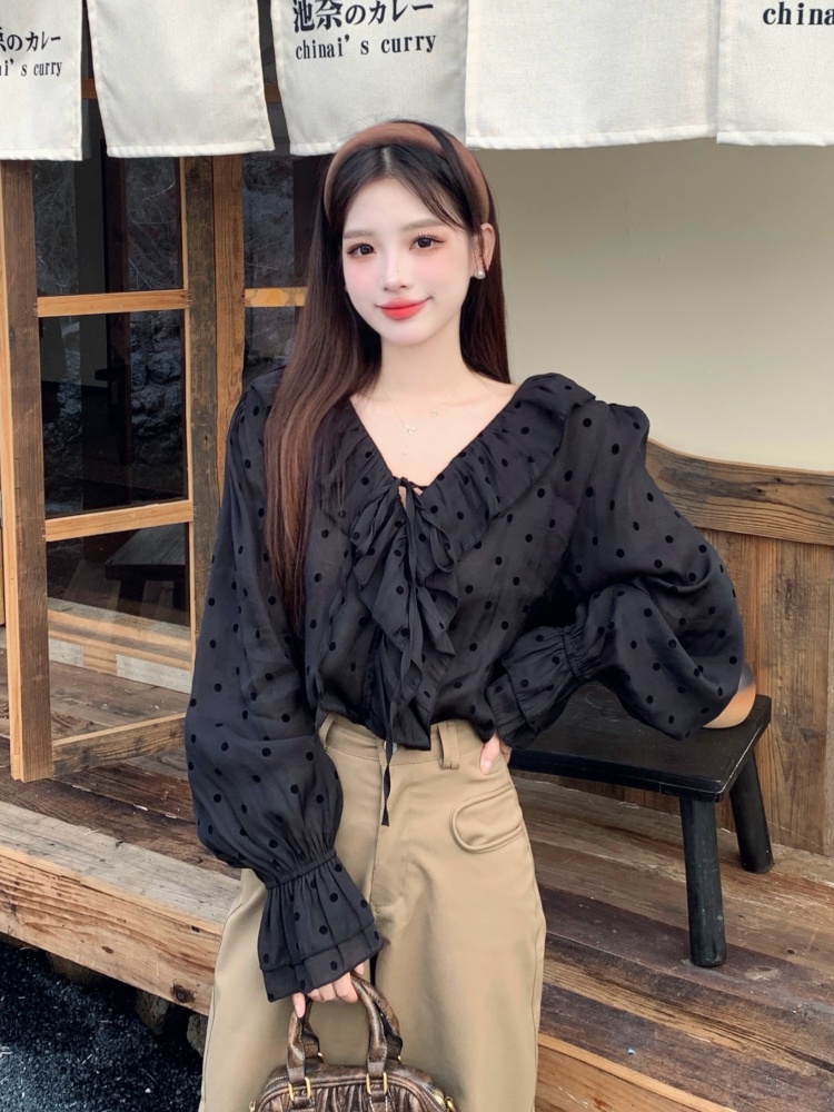 FA42109# 法式黑色波点荷叶边衬衫胖mm秋季V领泡泡袖设计感宽松雪纺上