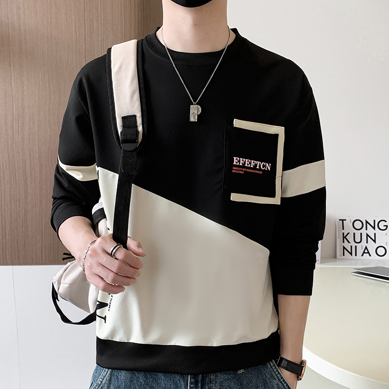 FA42362# 秋季新款卫衣男士圆领宽松套头无帽拼接撞色口袋打底衫工装长袖T恤上衣 男装批发