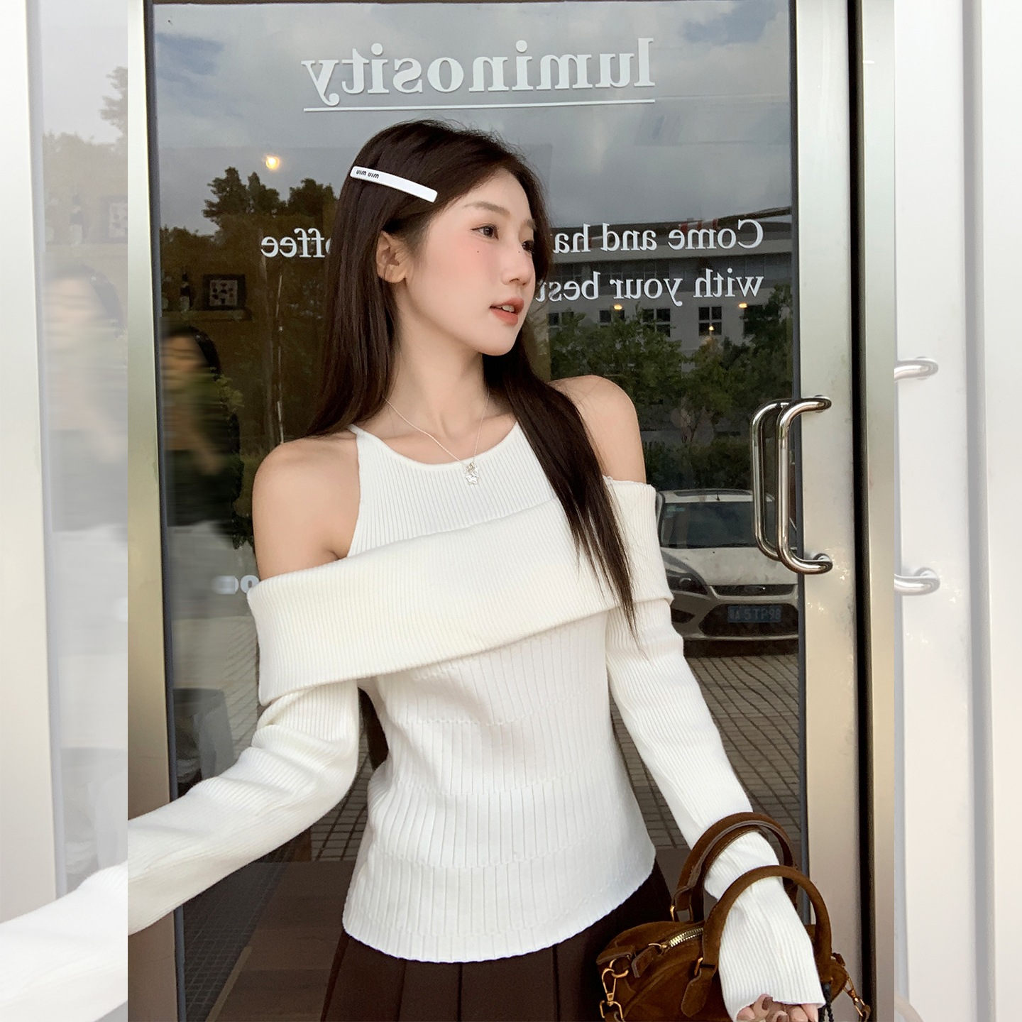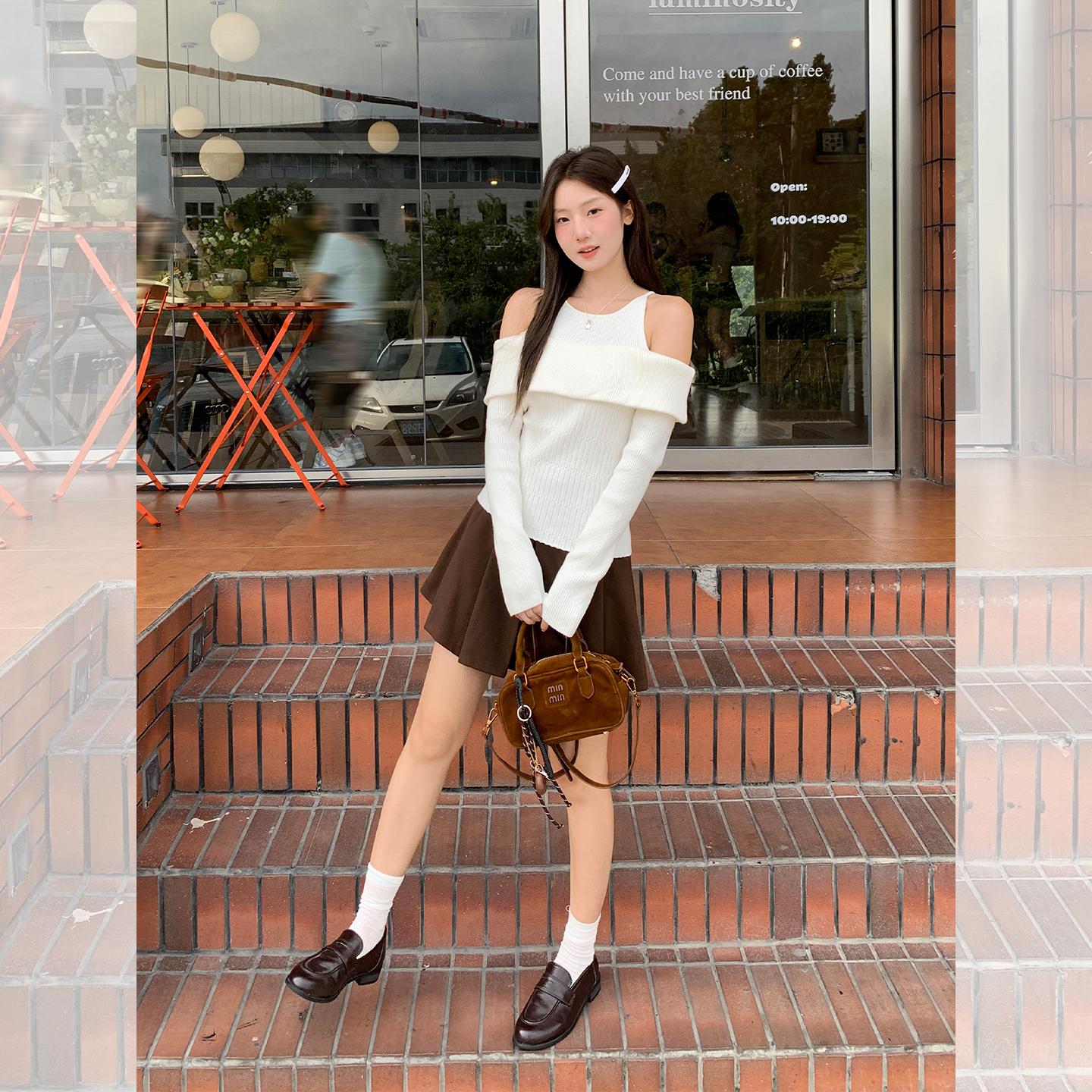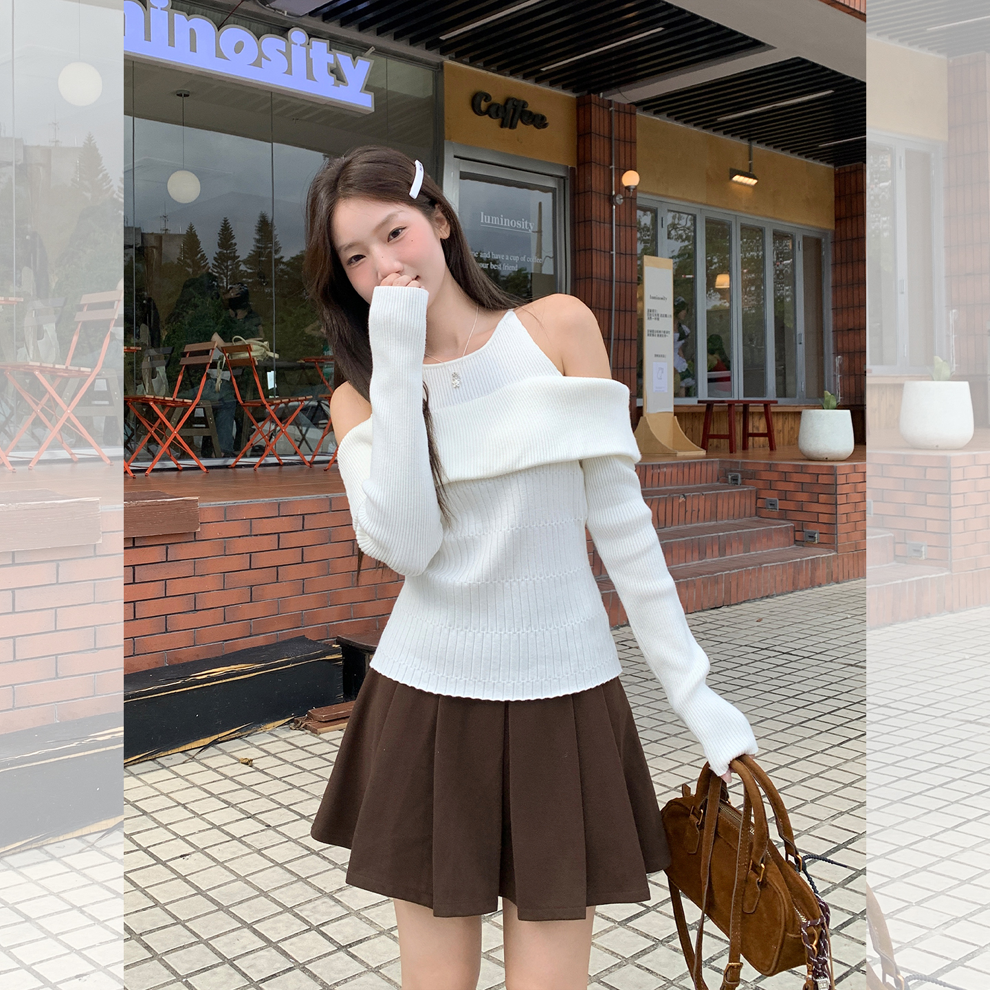 FA42658# 假两件一字肩针织毛衣女秋新款修身内搭温柔甜美露肩上衣 服裝批發女裝批發服飾貨源