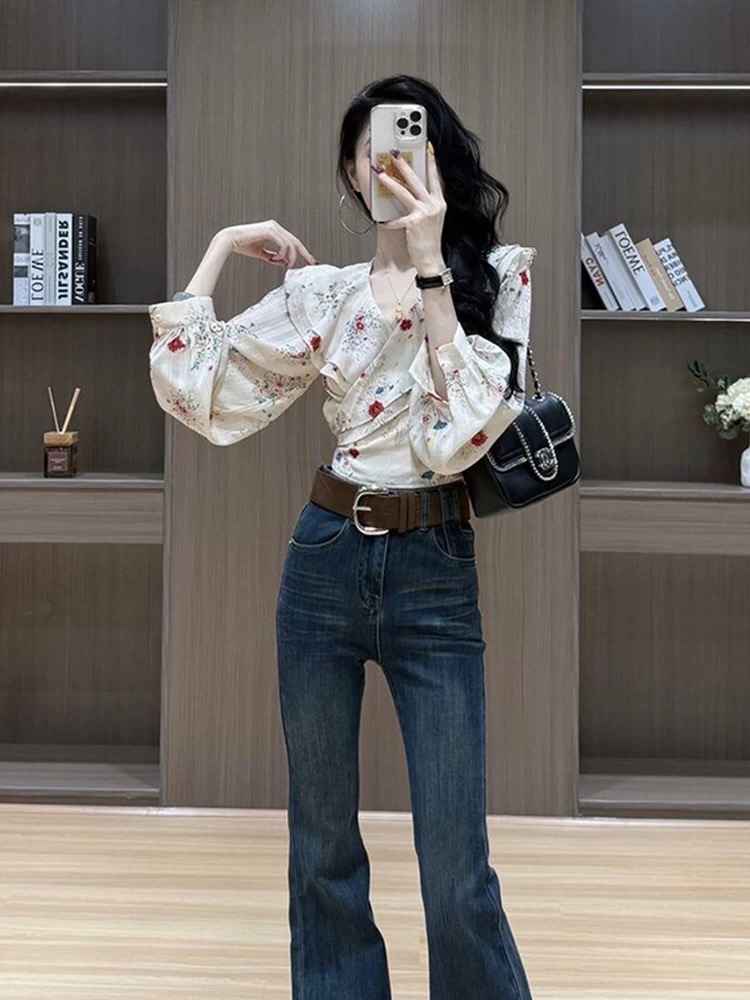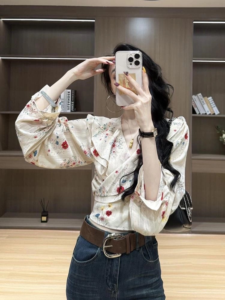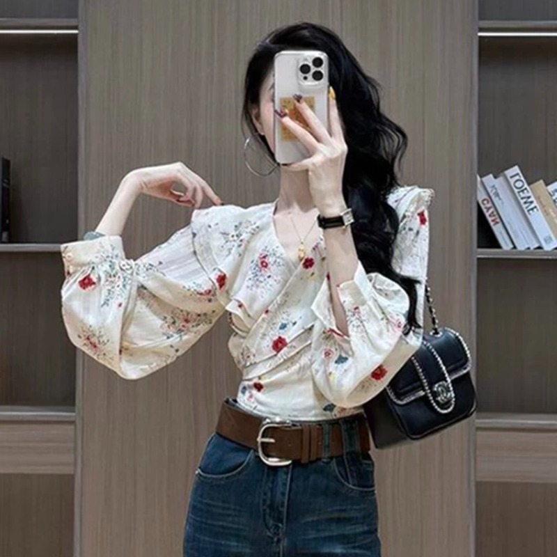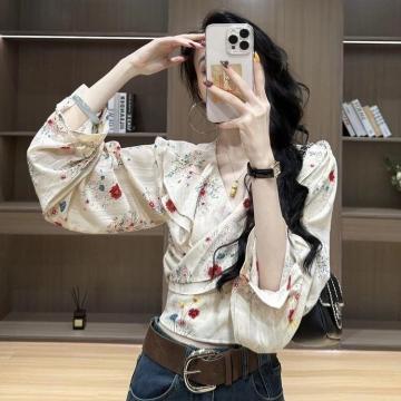 FA42672# 温柔气质减龄高级感时尚法式碎花衬衫女韩版百搭收腰系带白色上衣 服裝批發女裝批發服飾貨源