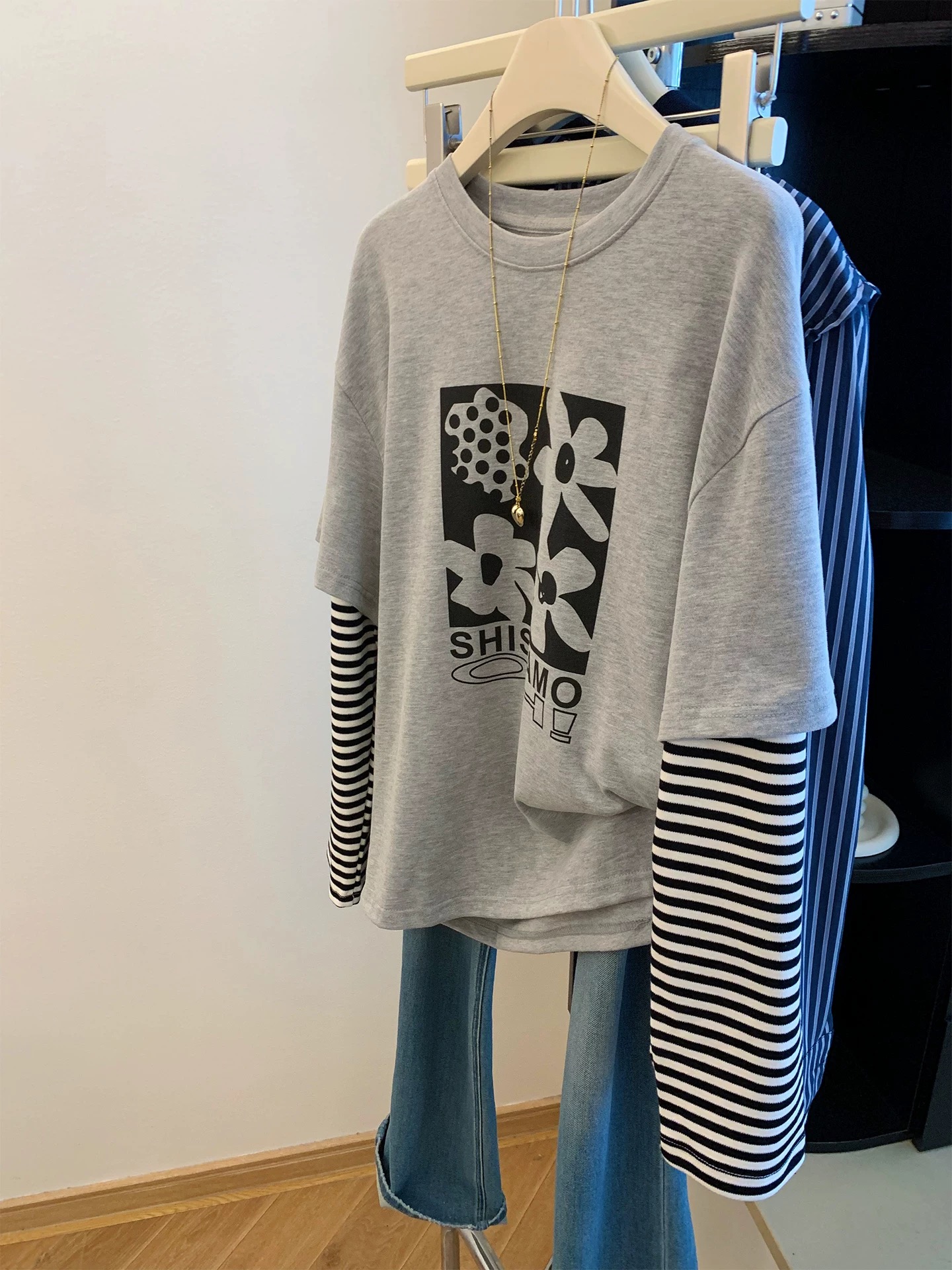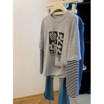 FA42811# 原版面料特大码300斤韩版百搭条纹假两件长袖T恤女韩系设计感上衣 服裝批發女裝批發服飾貨源