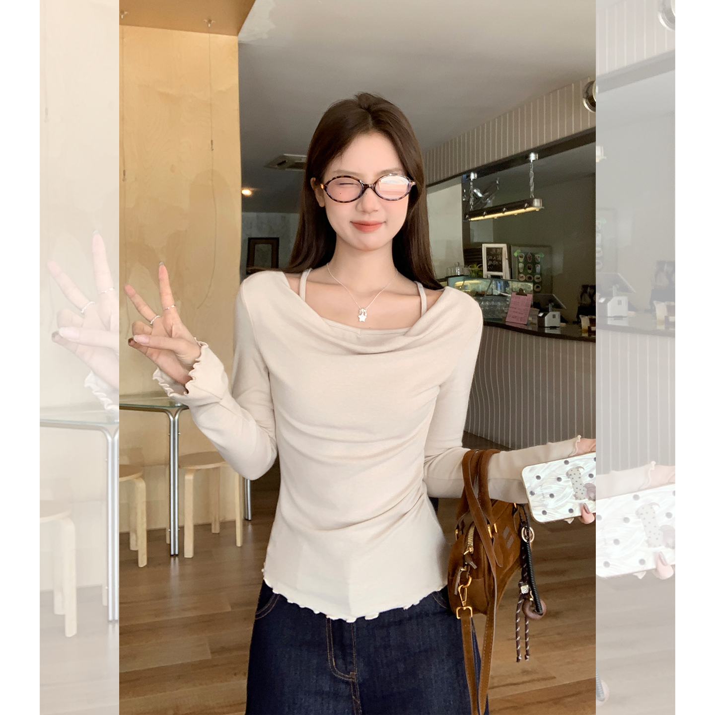 FA42815# 女秋季新款纯欲风设计感小众挂脖假两件荡领长袖上衣 服裝批發女裝批發服飾貨源