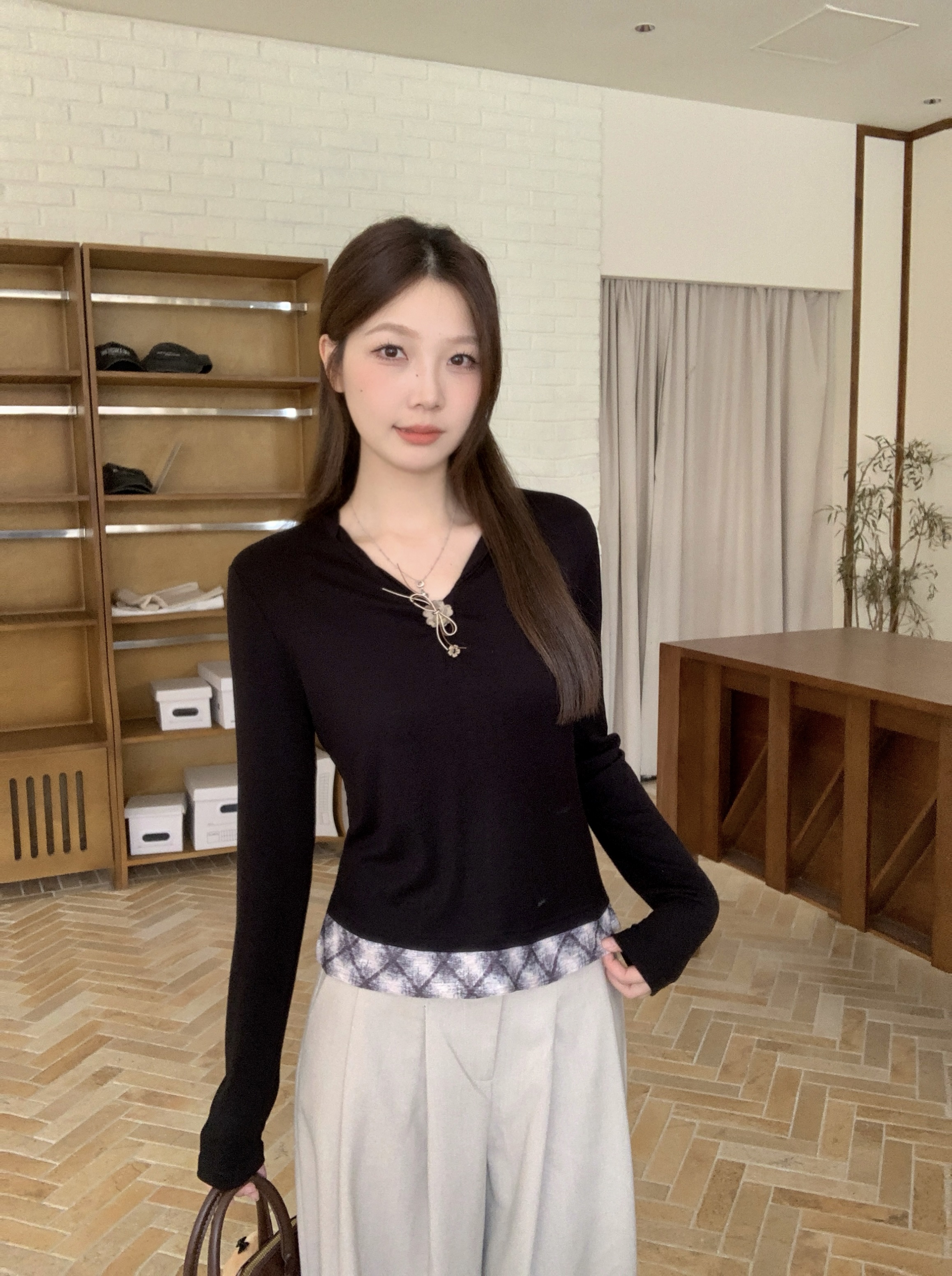 FA42823# 大码法式V领长袖T恤女秋冬高级修身显瘦假两件上衣 服裝批發女裝批發服飾貨源