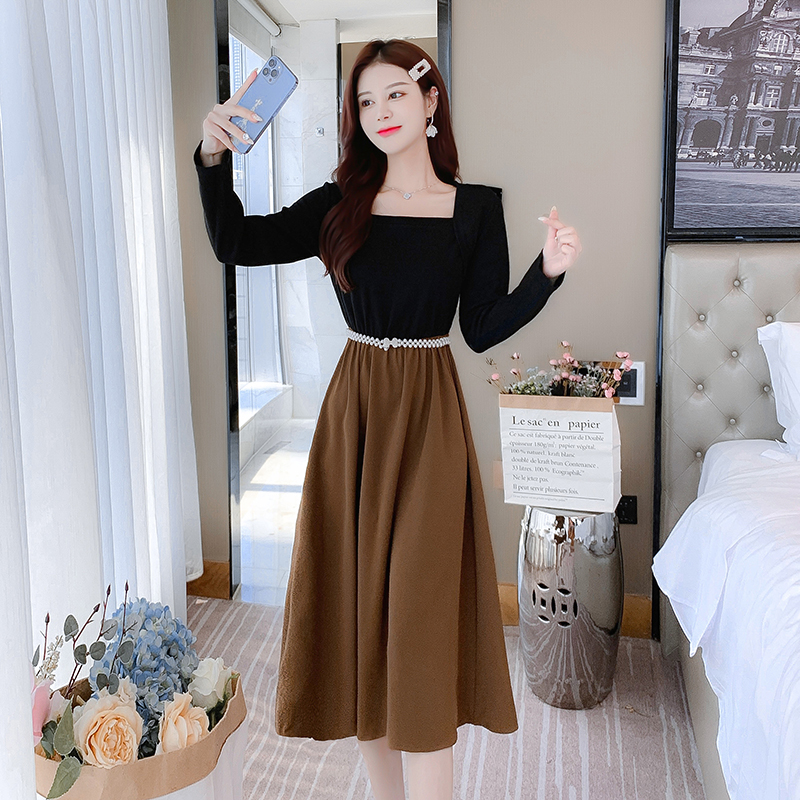 FA42967# 秋季法式小心机假两件连衣裙女中长款气质方领显瘦打底茶歇裙 服裝批發女裝批發服飾貨源
