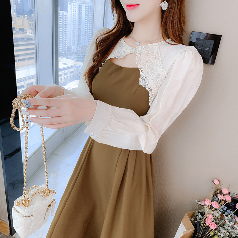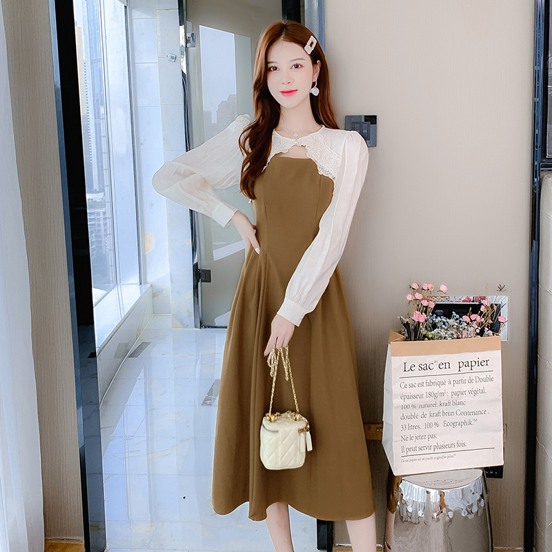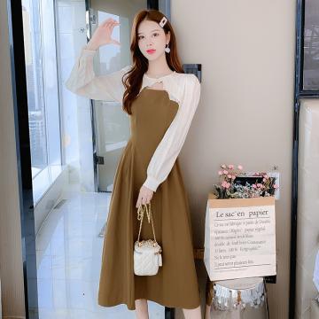FA42971# 初秋法式复古假两件拼色连衣裙女中长款衬衫袖减龄显瘦打底裙 服裝批發女裝批發服飾貨源