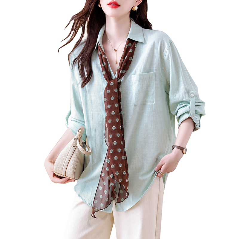 FA43032# 秋季新款棉麻衬衫薄荷绿清新V领显瘦宽松衬衫女送丝巾 服裝批發女裝批發服飾貨源