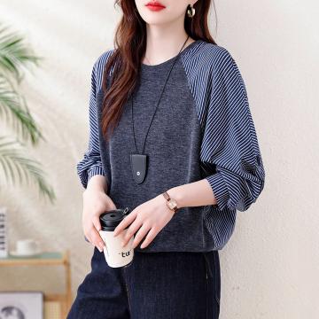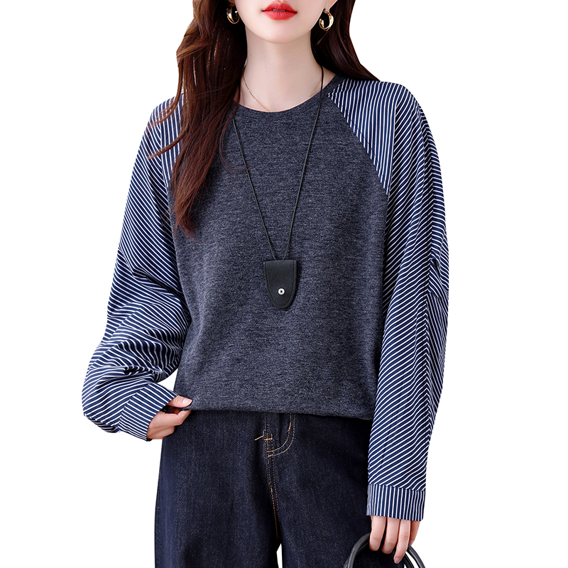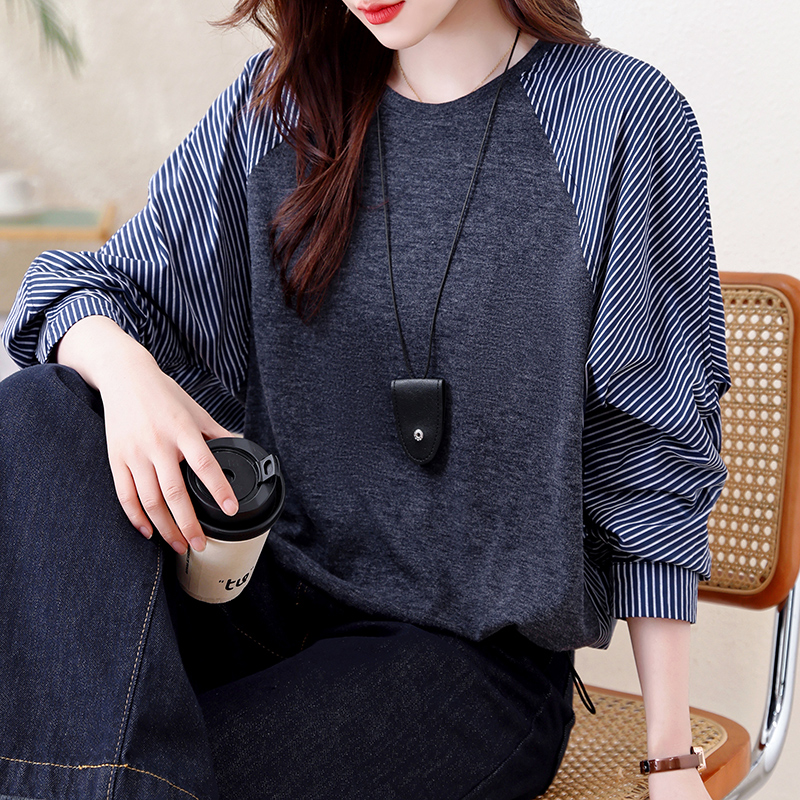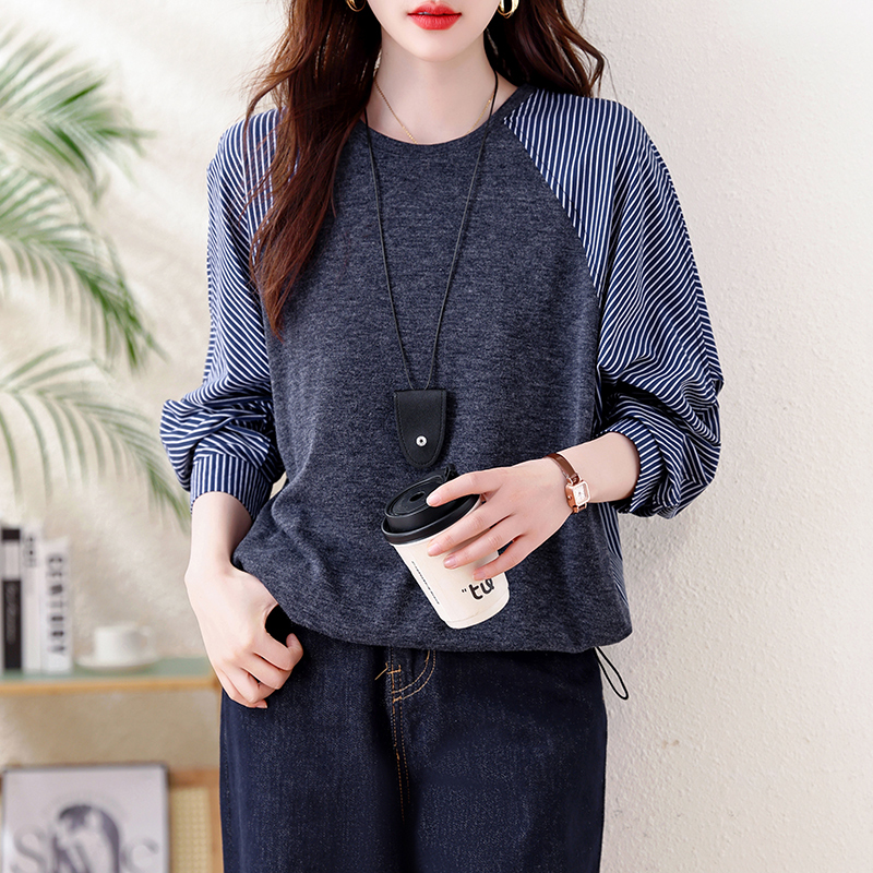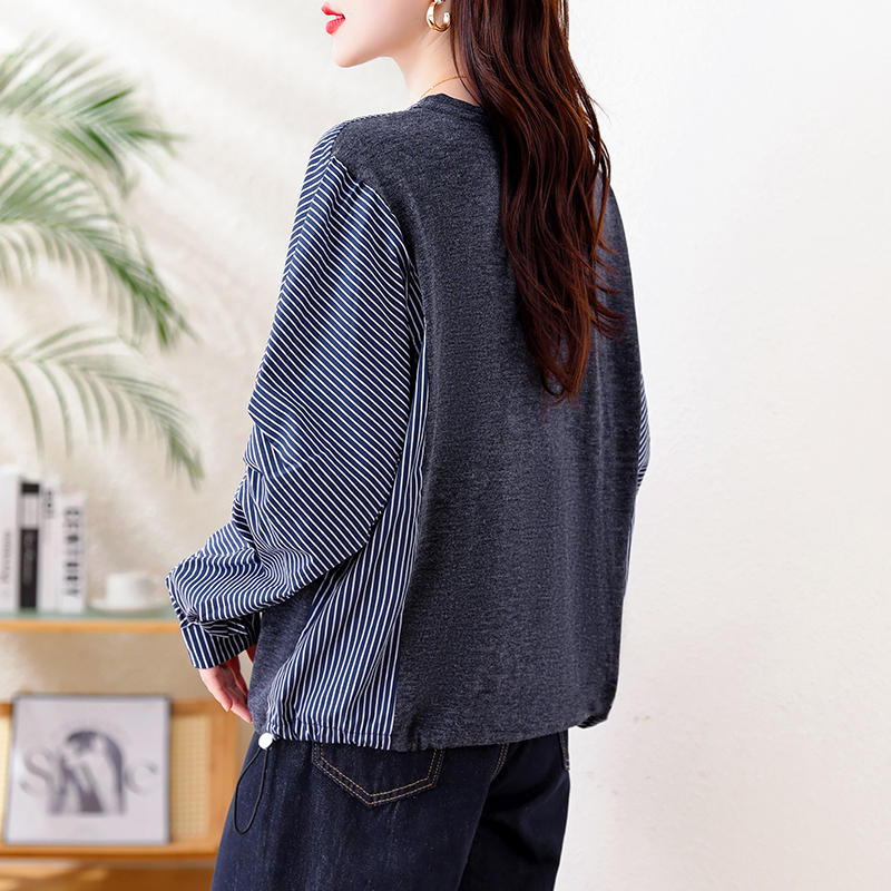 FA43037# 法式高级感撞色条纹拼接假两件圆领衬衫宽松遮肉显瘦百搭长袖上衣 服裝批發女裝批發服飾貨源