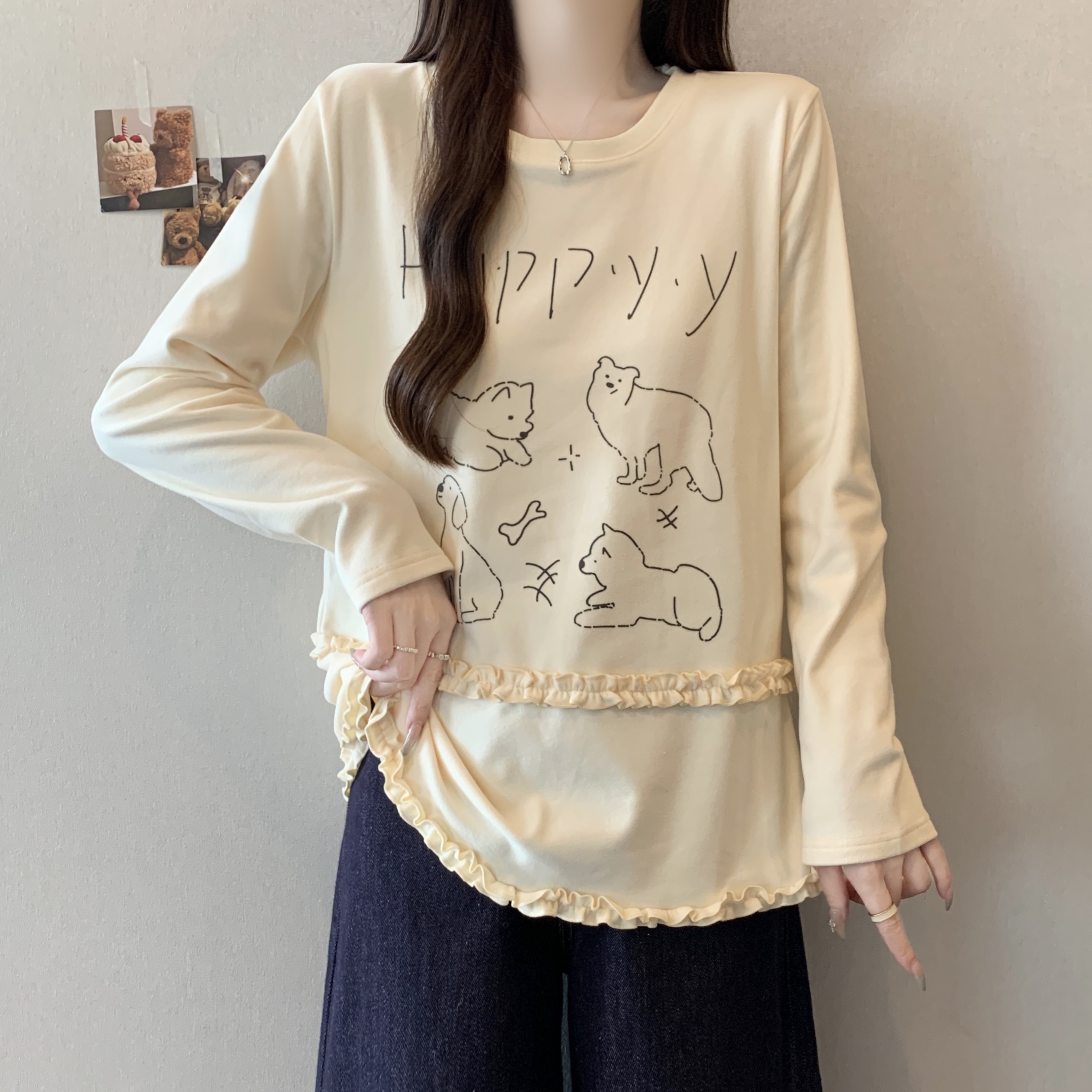 FA43045# 大码韩系气质百搭卡通印花秋季新款木耳拼接长袖T恤打底衫 服裝批發女裝批發服飾貨源