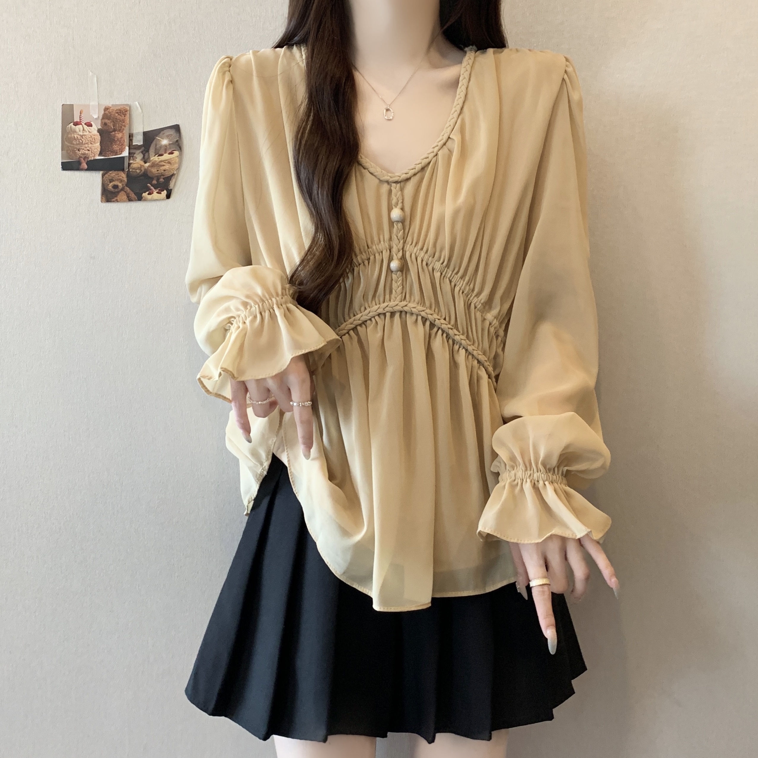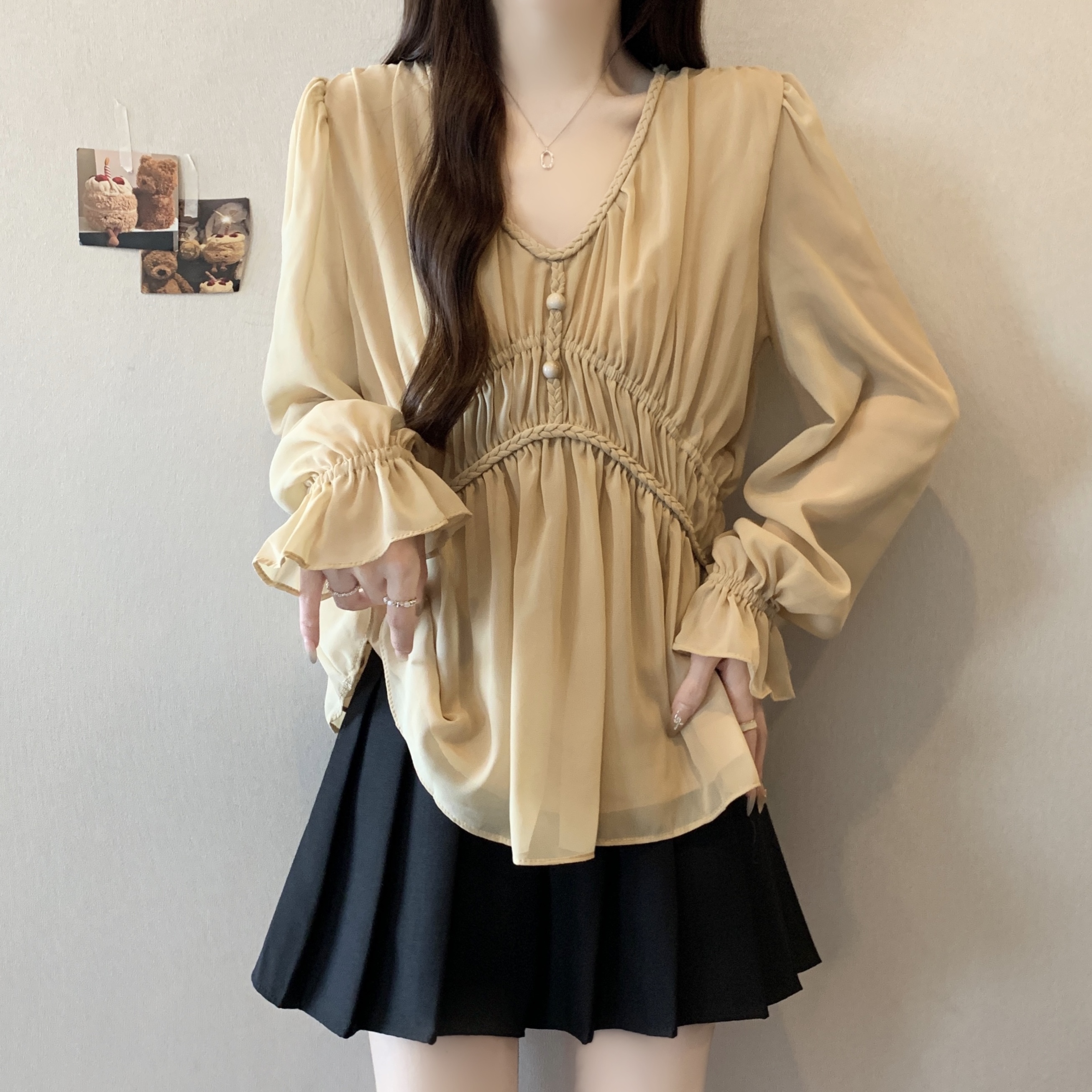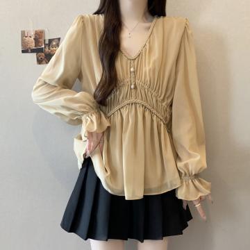 FA43049# 大码法式温柔V领收腰雪纺衬衫女早秋新款胖mm显瘦百搭上衣 服裝批發女裝批發服飾貨源