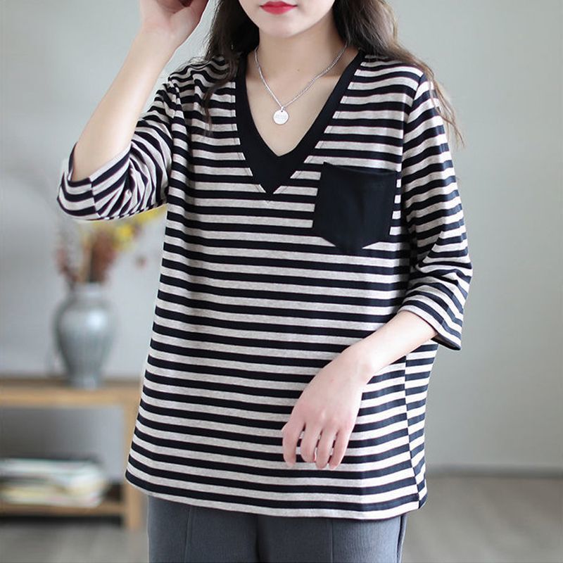 FA43108# 大码女装假两件条纹V领t恤女春秋新款2-300斤宽松大码七分袖上衣 服裝批發女裝批發服飾貨源