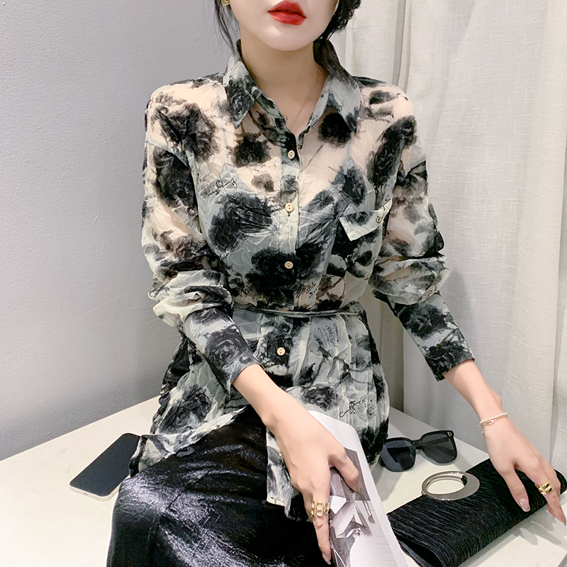 FA43156# 秋季新款印花复古单排扣长袖宽松型中长款POLO领百搭衬衫 服裝批發女裝批發服飾貨源