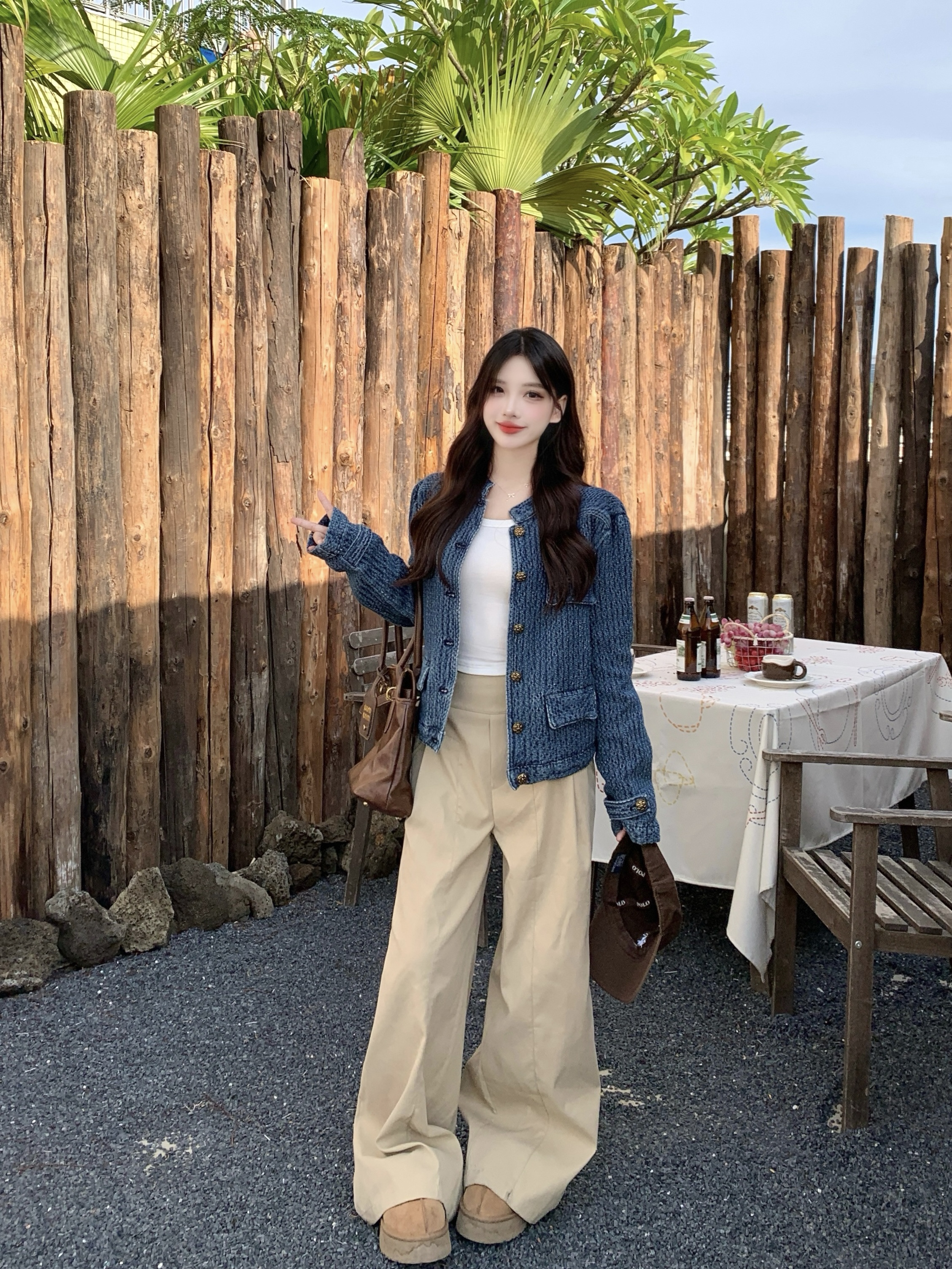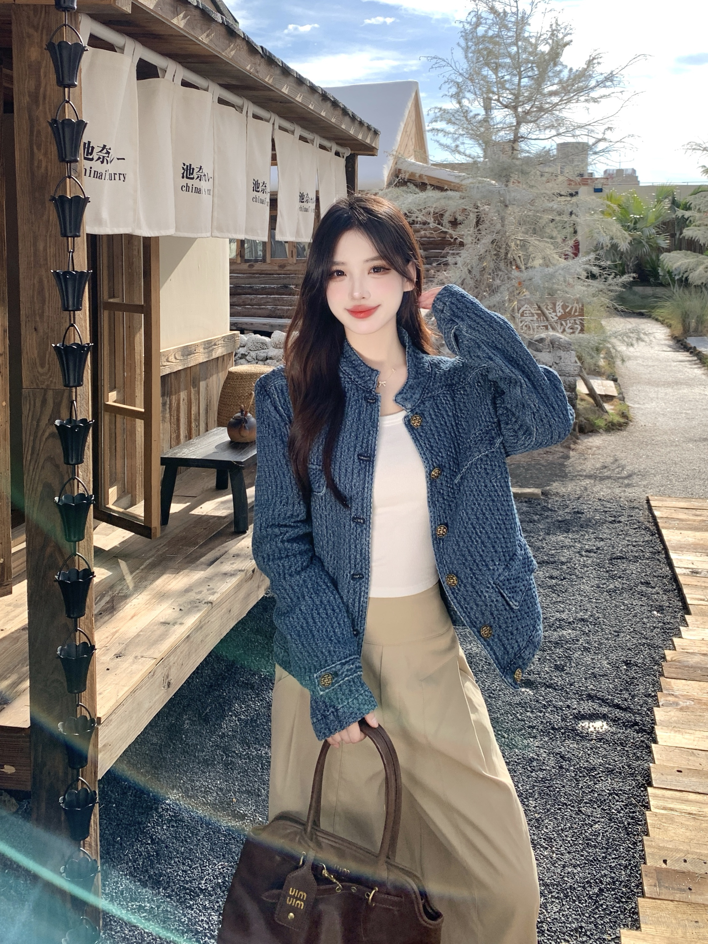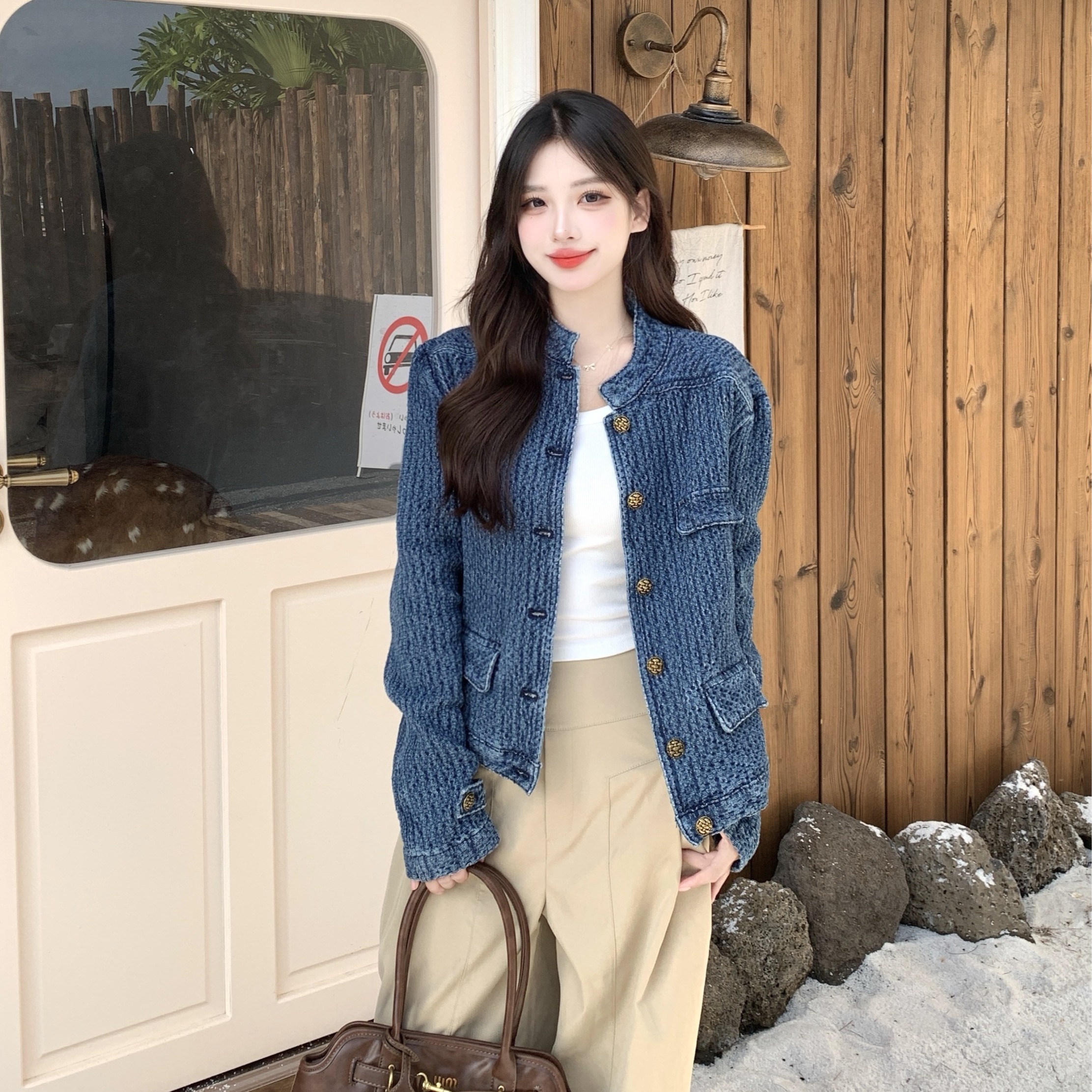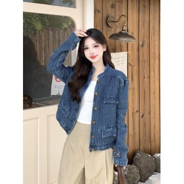 FA43209# 大码高级感蓝色提花牛仔外套女小香风宽松显瘦夹克长袖休闲短上衣 服裝批發女裝批發服飾貨源
