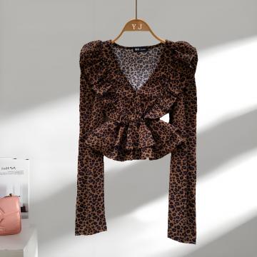 FA43213# 潮牌日韩风长袖衬衫女秋季新款法式温柔风V领荷叶边拼接收腰碎花雪纺衫 服裝批發女裝批發服飾貨源