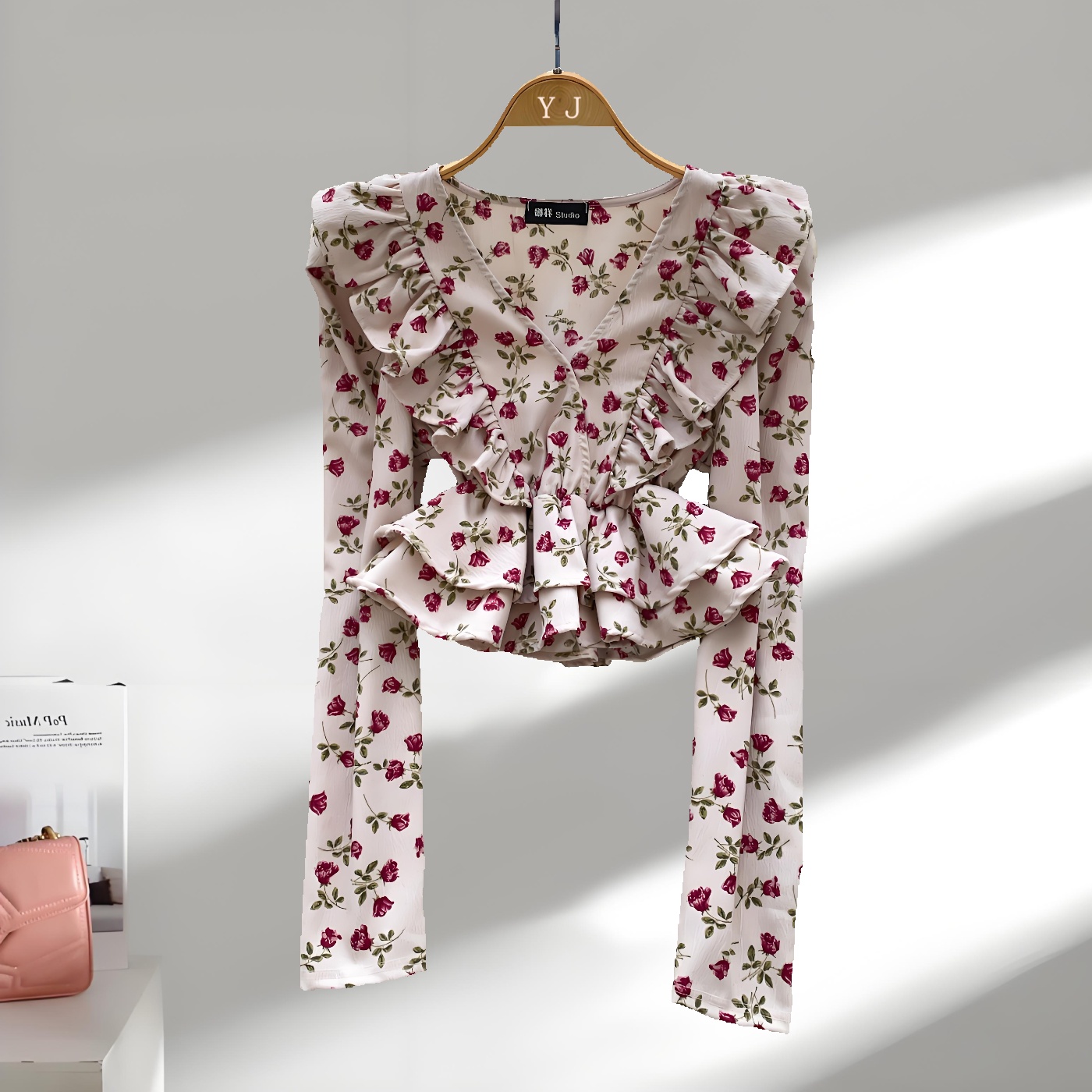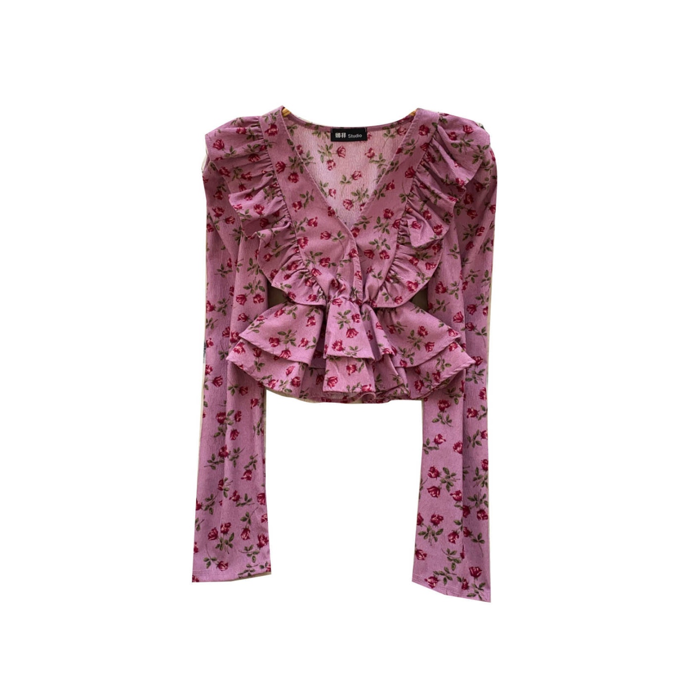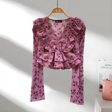 FA43215# 长袖衬衫女秋季新款法式温柔风V领荷叶边拼接收腰碎花雪纺衫 服裝批發女裝批發服飾貨源
