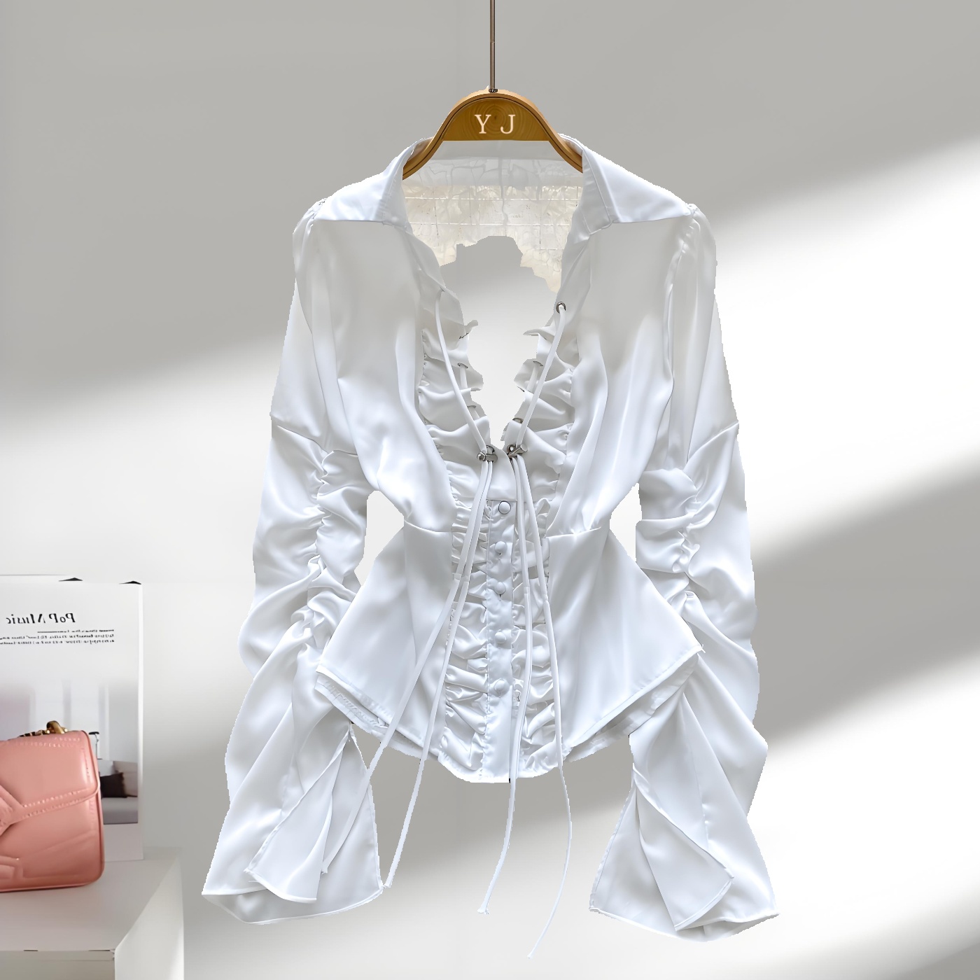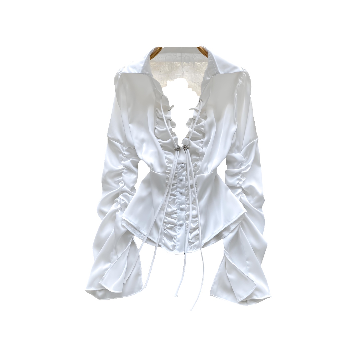 FA43219# 法式名媛V领系带长袖衬衫女秋季设计感心机露背绑带收腰上衣 服裝批發女裝批發服飾貨源