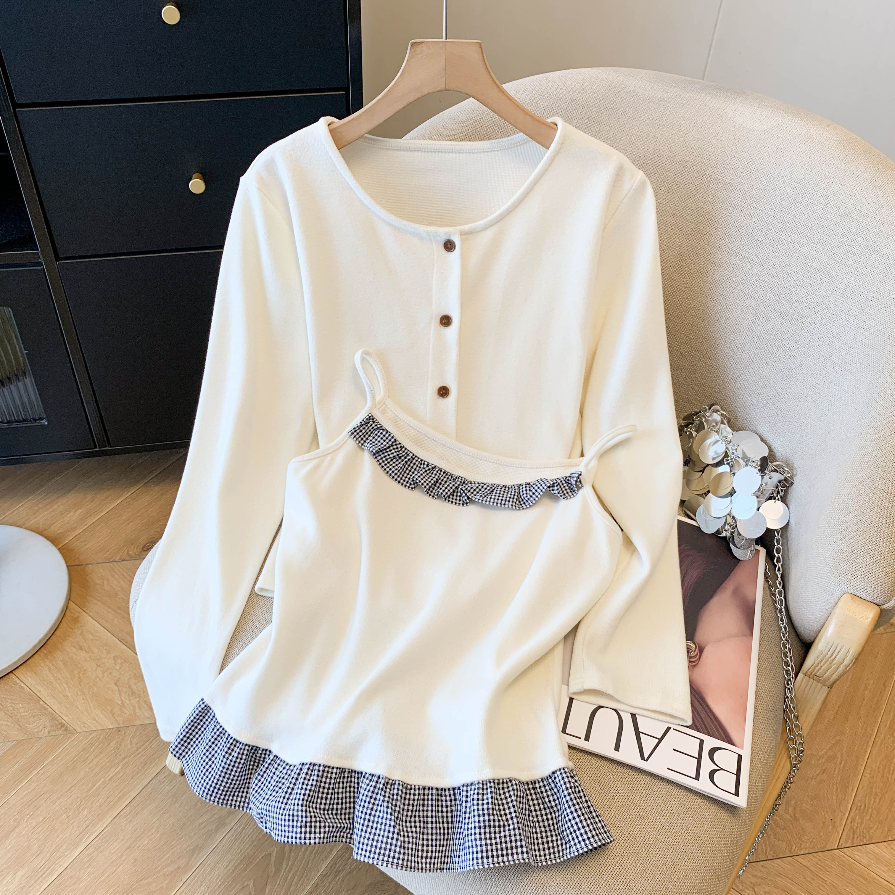 FA43240# 秋季新款韩版甜美格子拼接吊带衬衫女百搭气质显瘦开衫两件套 服裝批發女裝批發服飾貨源