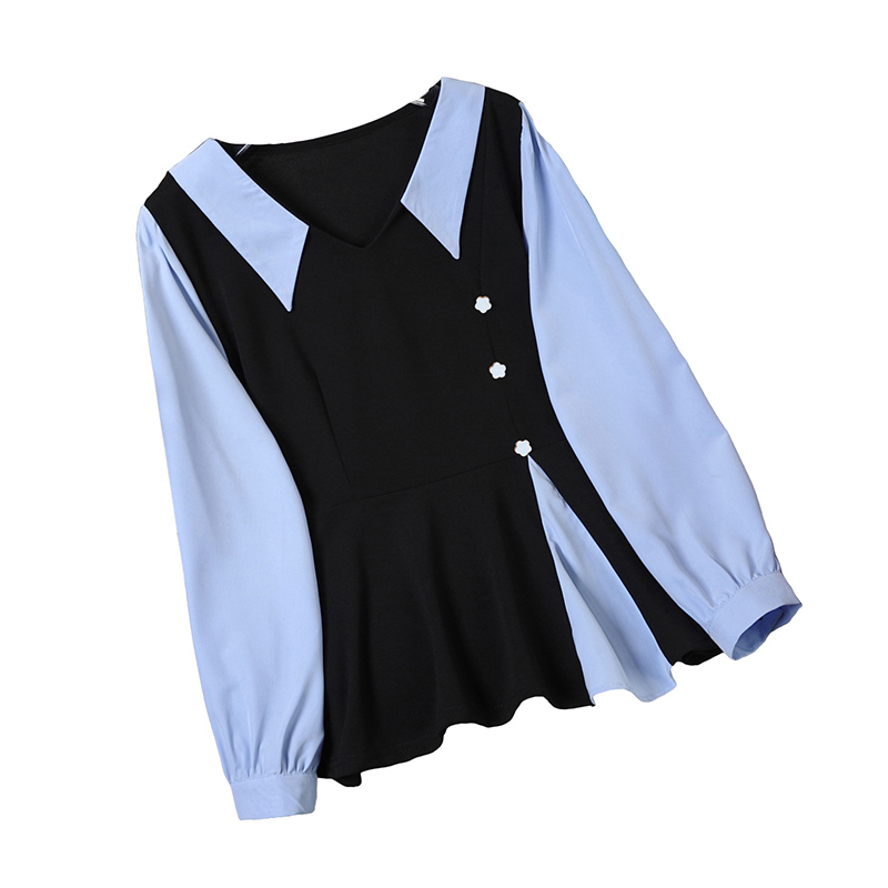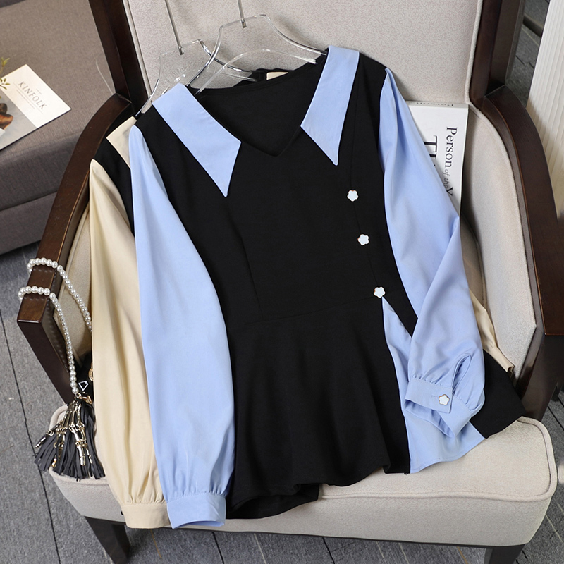 FA43392# 秋季新款大码女装胖MM翻领开叉撞色拼接假两件显瘦遮肚衬衣 服裝批發女裝批發服飾貨源