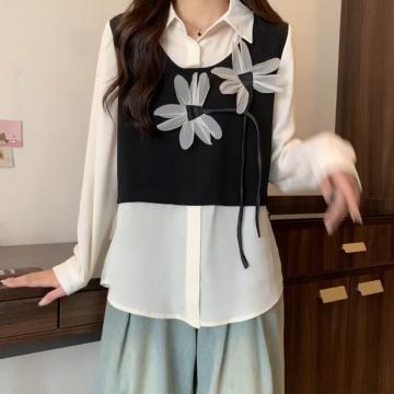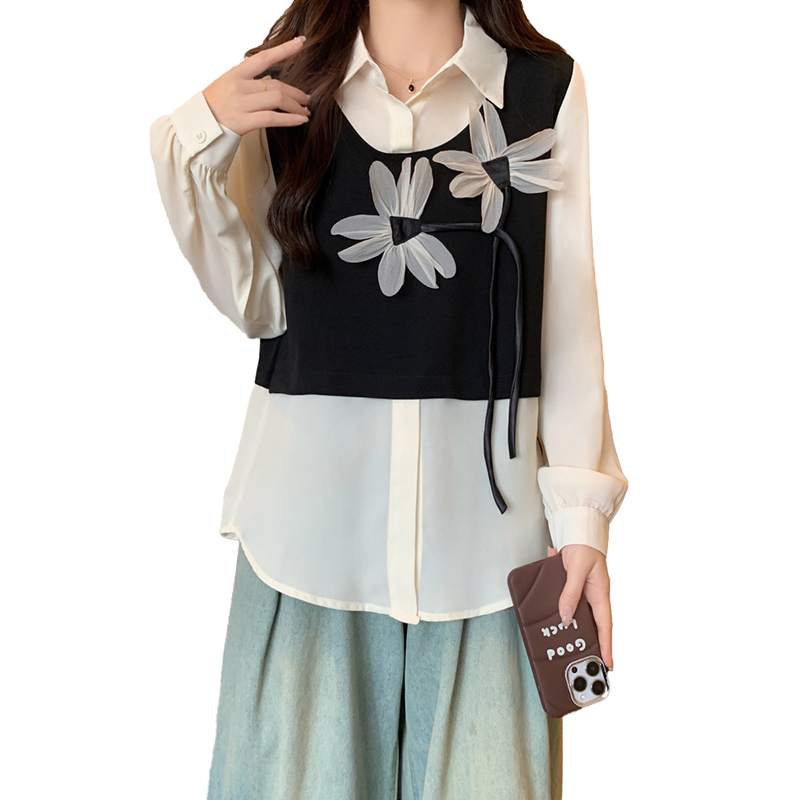Home > 长袖雪纺衫、衬衫、上衣 > FA43396# 早秋新款大码女装胖MM立体花朵假两件撞色拼接显瘦长袖衬衣 服裝批發女裝批發服飾貨源