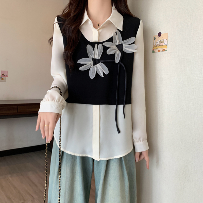FA43396# 早秋新款大码女装胖MM立体花朵假两件撞色拼接显瘦长袖衬衣 服裝批發女裝批發服飾貨源