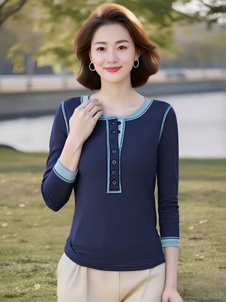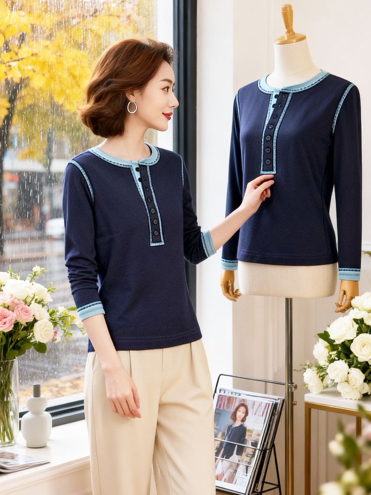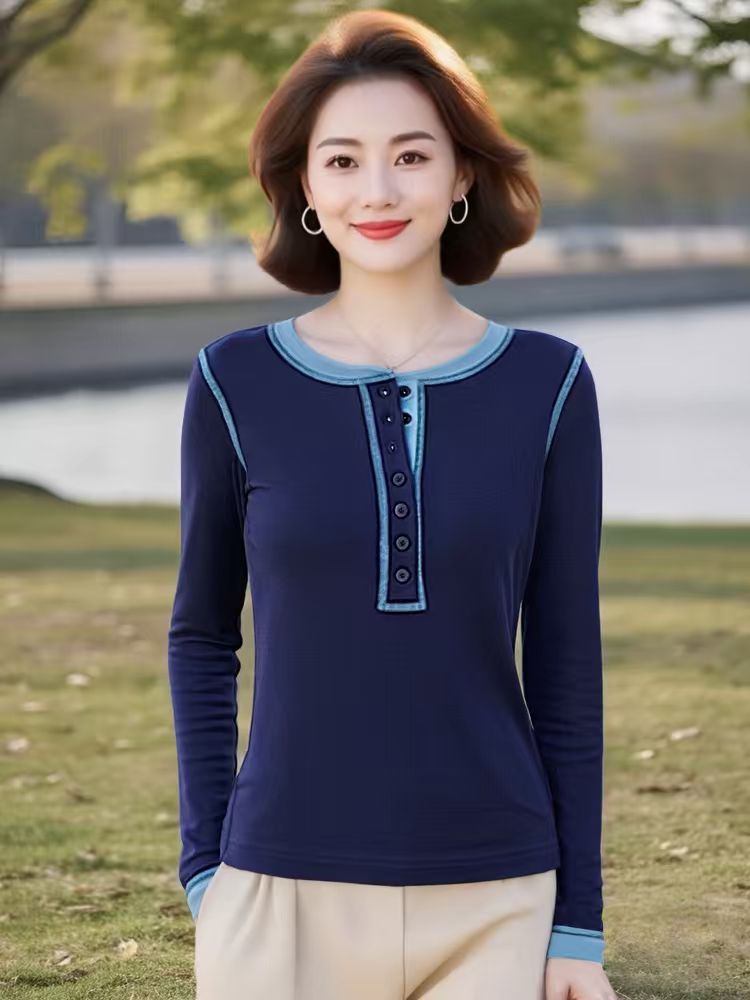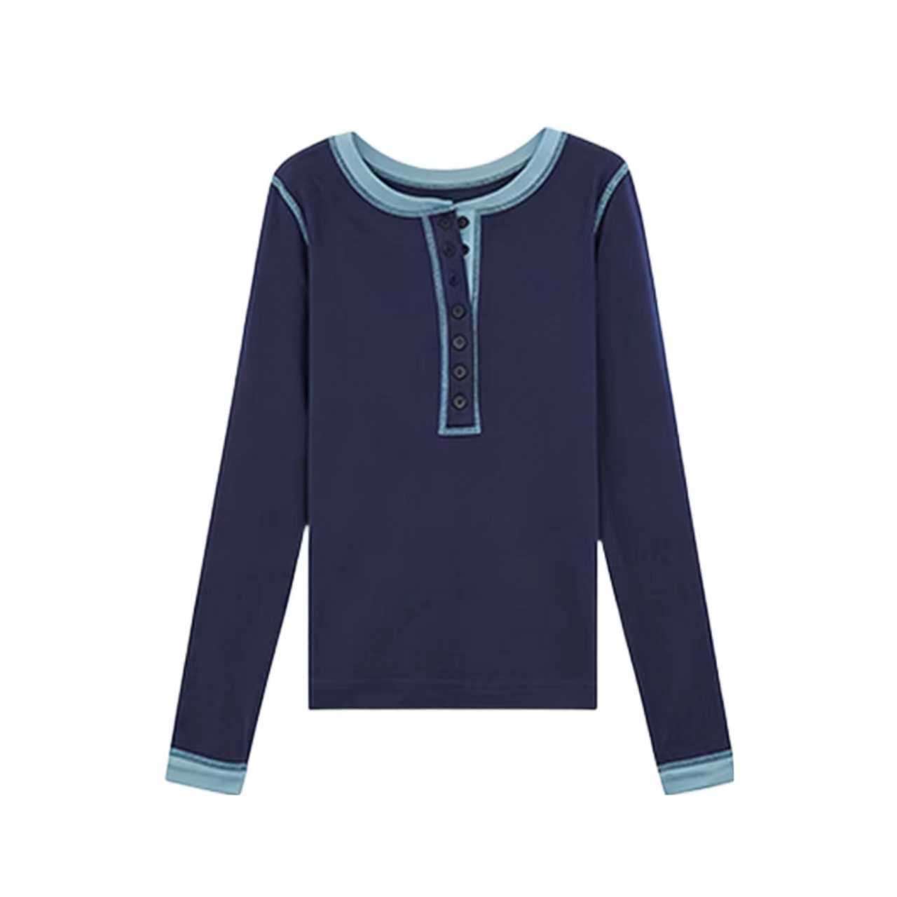 FA44152# 欧货撞色春秋新款内搭打底衫上衣潮圆领显瘦修身半开领长袖T恤女 服裝批發女裝批發服飾貨源