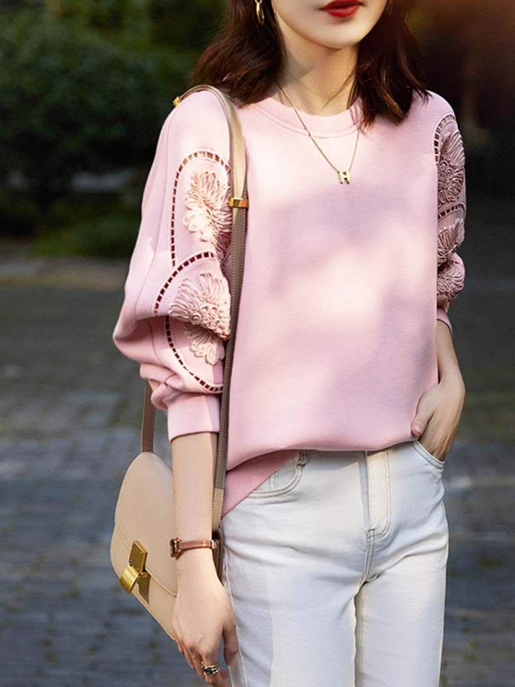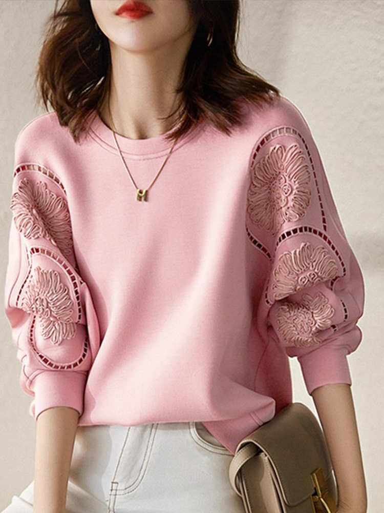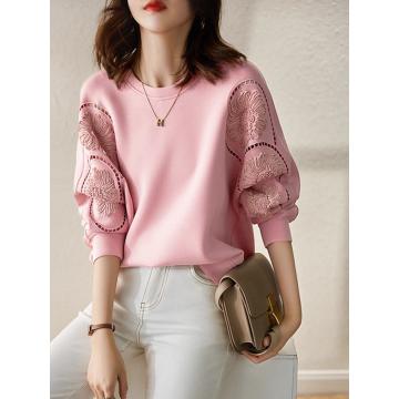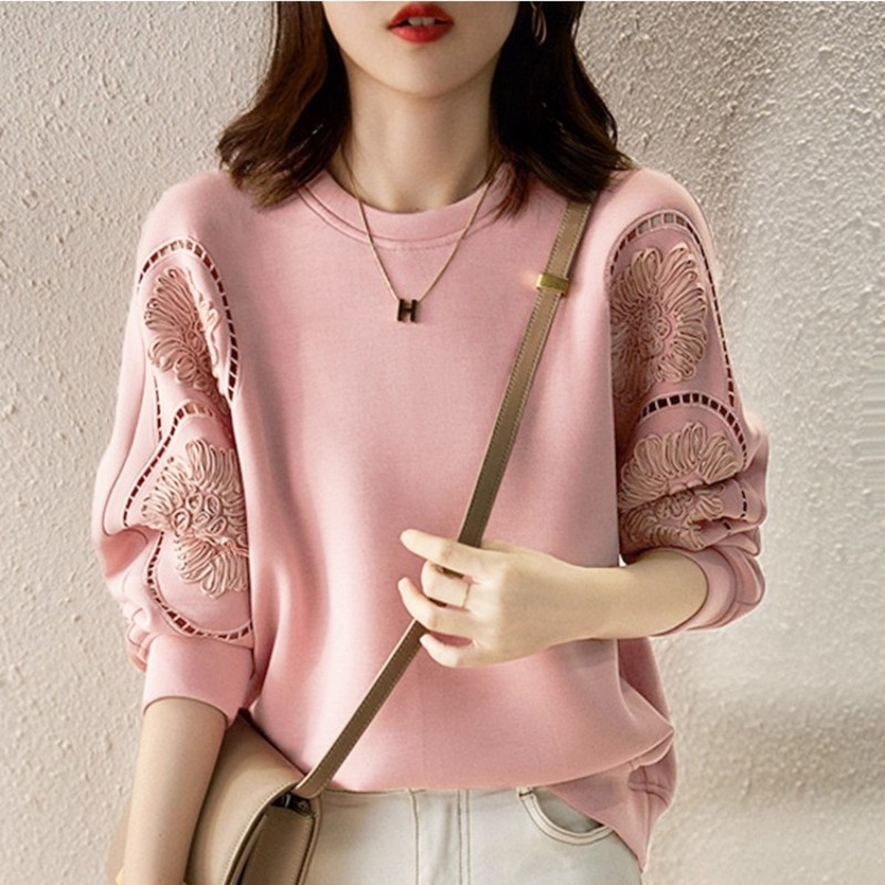 FA44159# 粉色圆领镂空长袖卫衣女新款宽松慵懒设计感小众时尚洋气上衣 服裝批發女裝批發服飾貨源