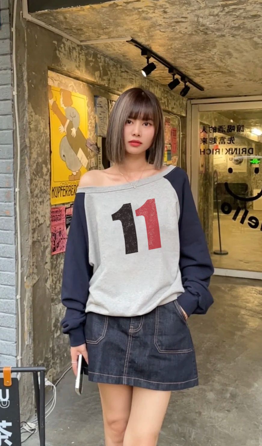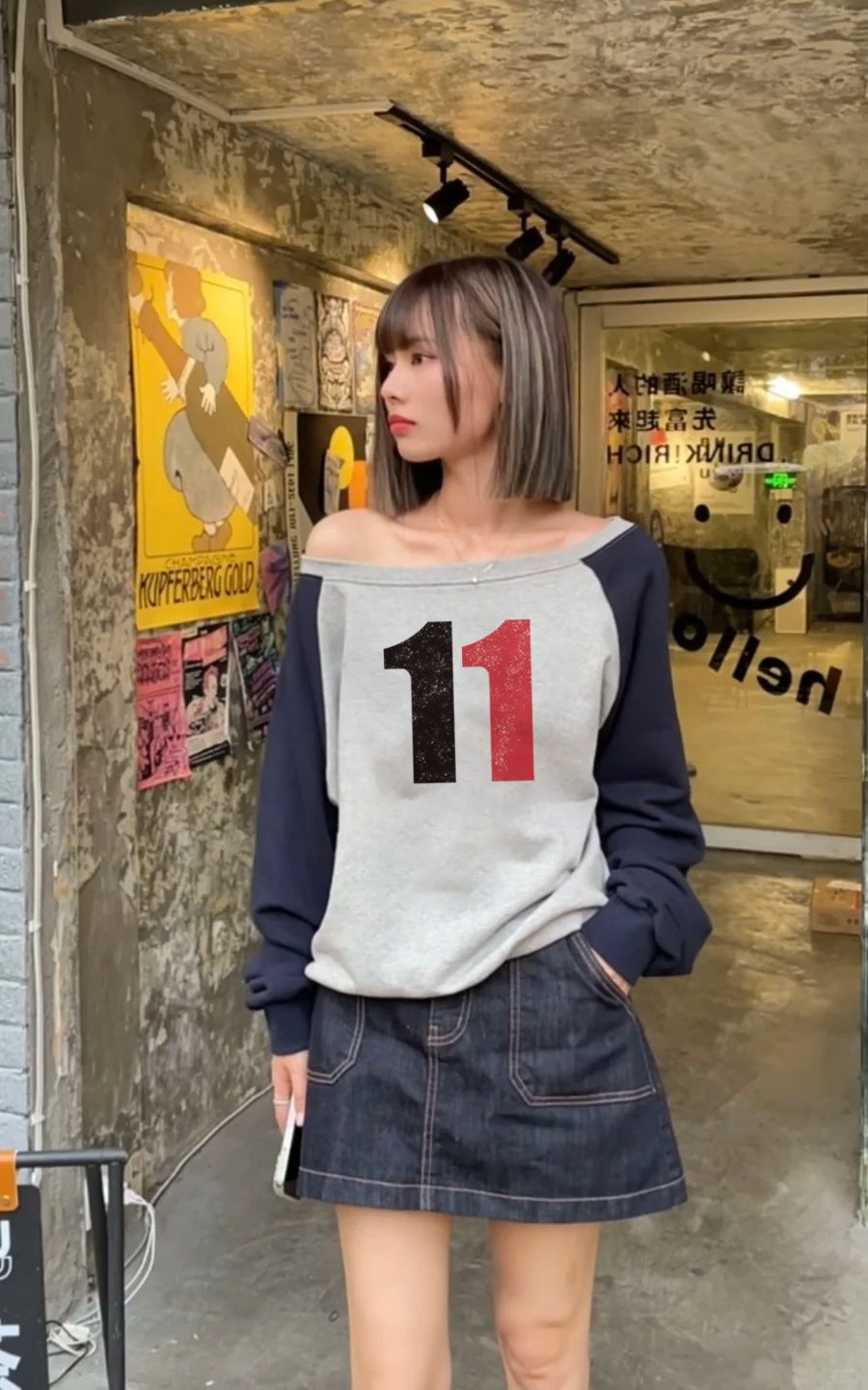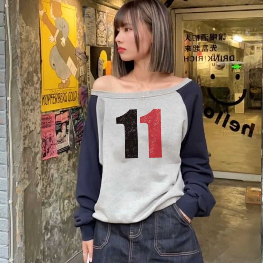 FA44181# 牛角柚插色CVC罗口后包领露肩斜肩卫衣女 服裝批發女裝批發服飾貨源