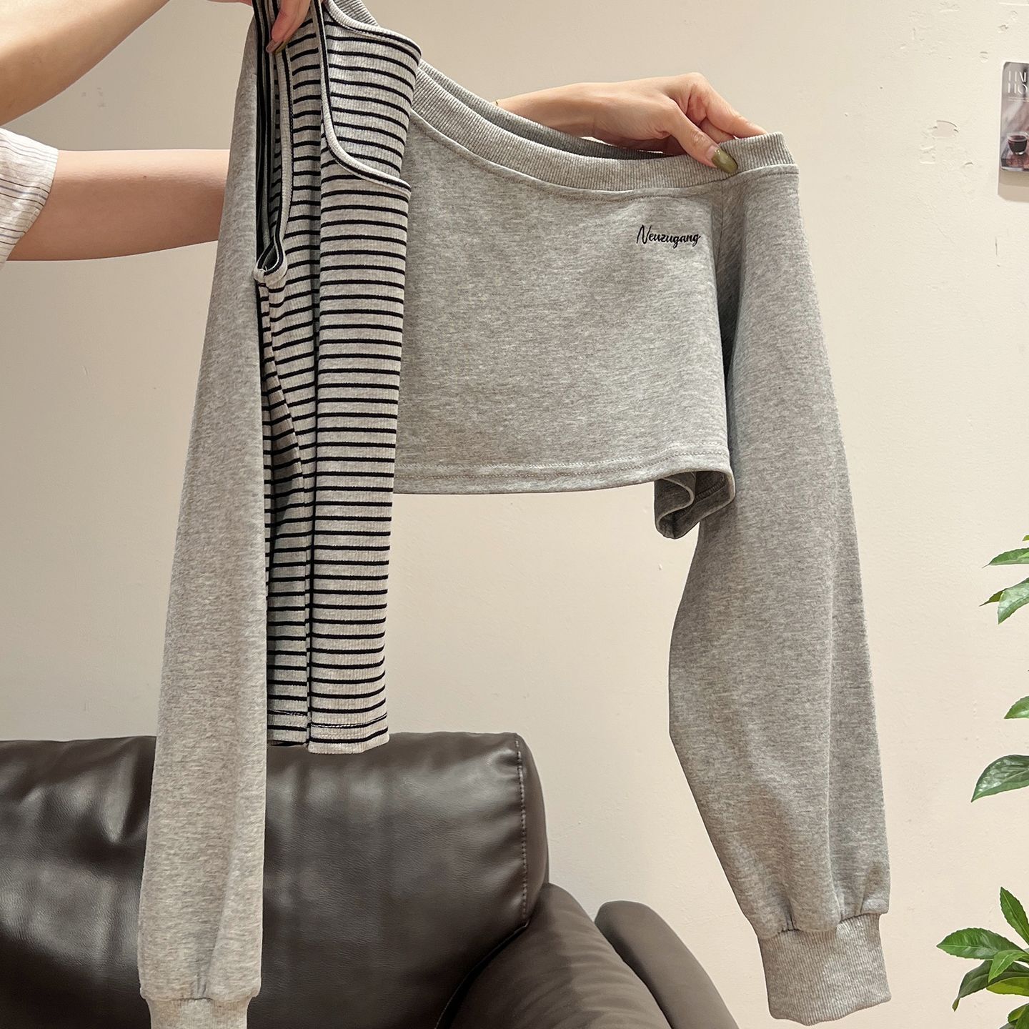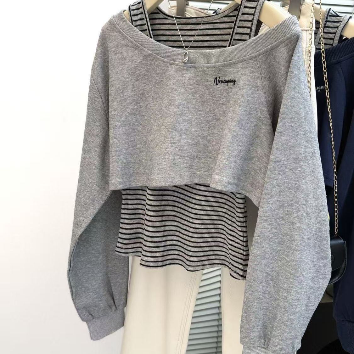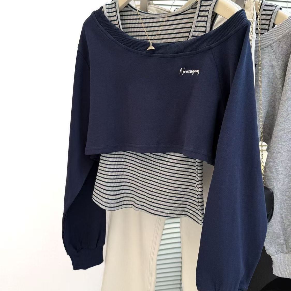 FA44351# 秋季新款藏蓝色灰色斜肩长袖条纹卫衣设计上衣搭配背心两件套 服裝批發女裝批發服飾貨源