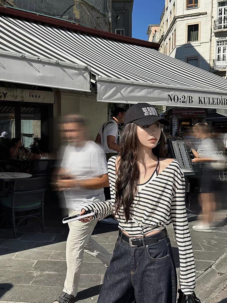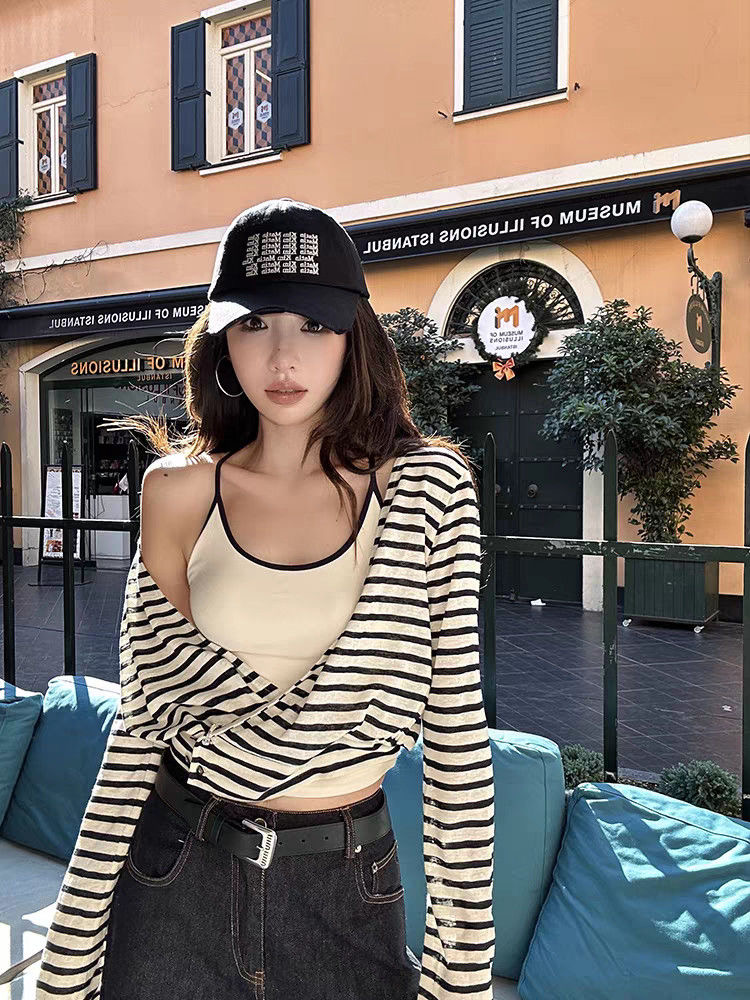 FA44671# 藏蓝色条纹罩衫女+吊带背心真两件叠穿套装 服裝批發女裝批發服飾貨源